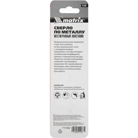 Сверло по металлу Matrix 717302 диаметром 3 мм, из стали HSS, с нитридтитановым покрытием и 6-гранным хвостовиком, предназначено для получения отверстий в черном металле, стали, чугуне и твердой бронзе. Устанавливается в патрон дрели.ПреимуществаПрочность — сверло изготовлено из быстрорежущей стали HSS.Высокий ресурс — нитридтитановое покрытие обеспечивает стойкость оснастки к коррозии и перегреву.Эффективная работа — за счет полированной поверхности сверло меньше подвержено трению и лучше отводит стружку.Надежная фиксация — шестигранный хвостовик не проворачивается в патроне дрели.