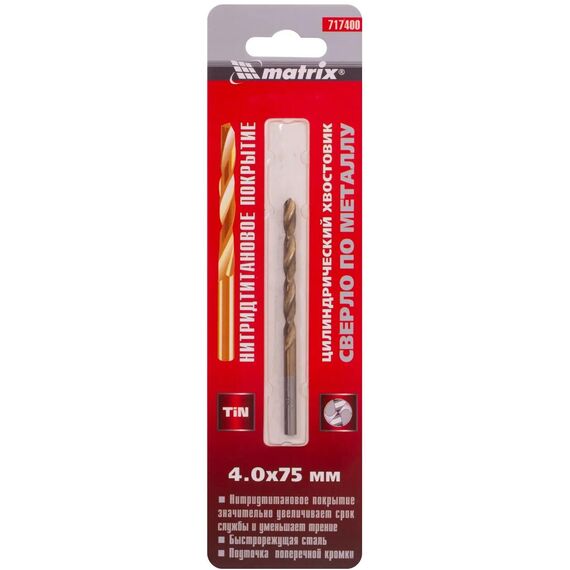 Сверло Matrix 717400 диаметром 4 мм, из стали HSS, с нитридтитановым покрытием и цилиндрическим хвостовиком, предназначено для получения отверстий в металле. Угол заточки 118° оптимален для работы с черными металлами, сталью, чугуном и твердой бронзой.