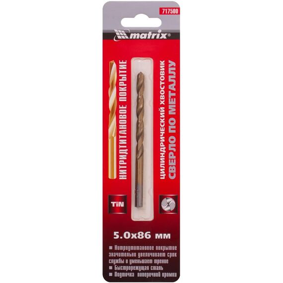Сверло Matrix 717500 диаметром 5 мм, из стали HSS, с нитридтитановым покрытием и цилиндрическим хвостовиком, предназначено для получения отверстий в металле. Угол заточки 118° оптимален для работы с черными металлами, сталью, чугуном и твердой бронзой.