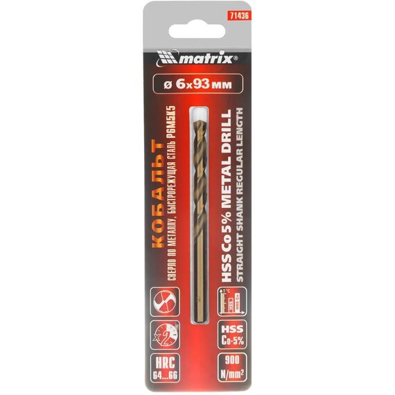 Сверло Matrix 71436 диаметром 6 мм, из стали HSS Co-5%, имеет угол заточки 135°, оптимальный для сверления легированных и цветных металлов.