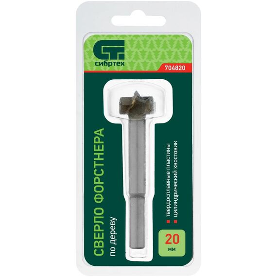 Сверло Форстнера по дереву Сибртех 704820 с цилиндрическим хвостовиком, используется для получения глухих отверстий диаметром 20 мм в древесине, ДСП, ДВП и других материалах.