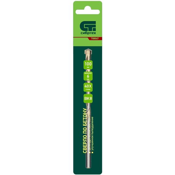 Сверло по бетону Сибртех 708067 диаметром 6 мм и длиной 100 мм, с цилиндрическим хвостовиком и улучшенным пылеудалением, предназначено для сверления в ударном режиме бетона и кирпича.