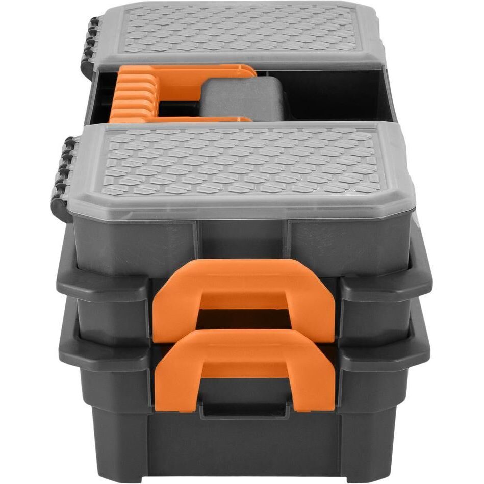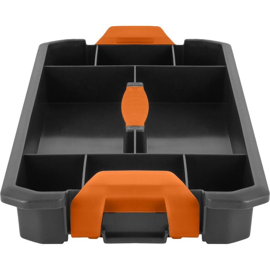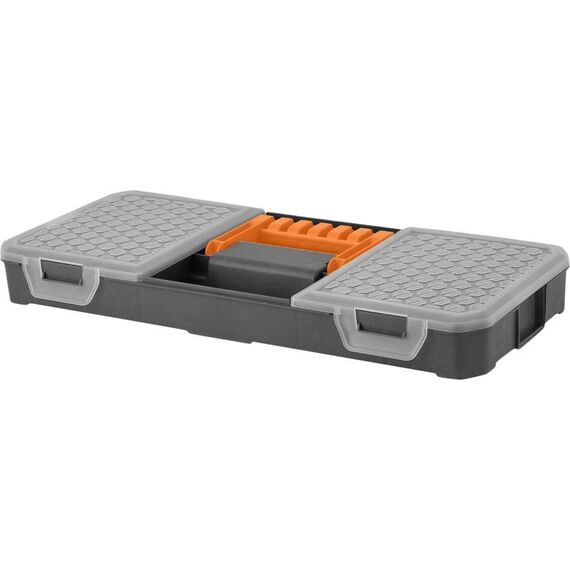 Органайзер для мелочей c двумя лотками помогает содержать в порядке, переносить на место выполнения работ и быстро находить инструменты, метизы и аксессуары. Идеален для использования дома, на даче, в гараже, мастерской, в автомобиле. Для удобства переноски органайзер и лотки скрепляются вместе с помощью защёлок. Органайзер и мелкий лоток оснащены складными ручками. Внутреннее деление на отсеки делает удобным размещение внутри органайзера и лотка деталей, которые необходимо отделить друг от друга. Подходит для хранения рыболовных и швейных принадлежностей, коллекционирования, занятия хобби.