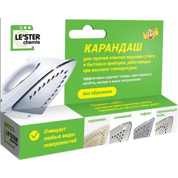 LESTER CH-i1 карандаш для очистки подошвы утюга Карандаш для горячей очистки подошвы утюга и бытовых приборов, работающих при высоких температурах. Применяется для удаления престарелого налёта, нагара и тёмных пятен на подошве утюга, с любого покрытия, а именно керамики, тефлона, нержавеющей стали, алюминия. Упаковка пригодна для многократного использования. Средство безопасно для здоровья человека, может применяться без последующей очистки. Способ применения: Нагрейте утюг до 130-140 (настройте положение терморегулятора утюга на режим "шерсть" или "две точки"). Нанесите равномерными движениями плавящийся карандаш на нагретую поверхность. Снимите слой смеси с подошвы вместе с налётом и нагаром льняной или х/б тканью. Для очистки поверхности в паровом утюге выпустить струю пара. После использования уберите карандаш обратно в упаковку до следующего применения.