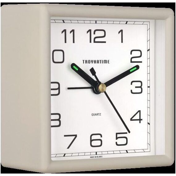 Настольные часы-будильник, модель 08.60.810, пластиковый корпус, размер 95*95мм, кварцевый механизм с сигналом, цвет-бежевый матовый.