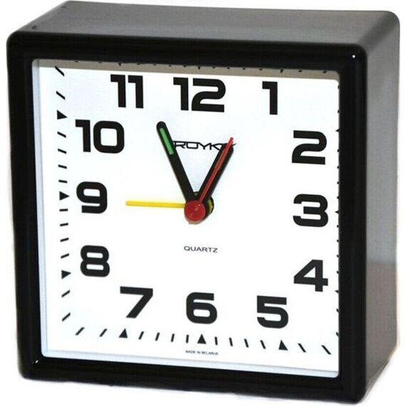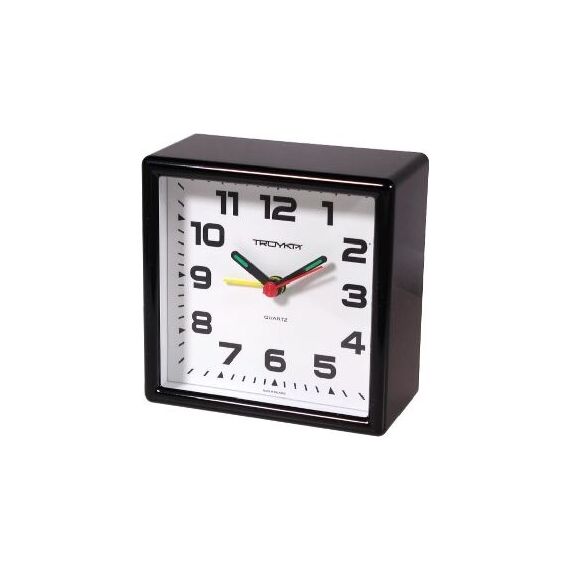 Категория: будильники, Тип механизма: кварцевый, Материал корпуса: пластик, Точный размер корпуса: 95х95х46 мм, Цвет корпуса: черный, Цвет циферблата: белый, Циферблат: стрелочный, Цифры: арабские, Ход: шаговый.