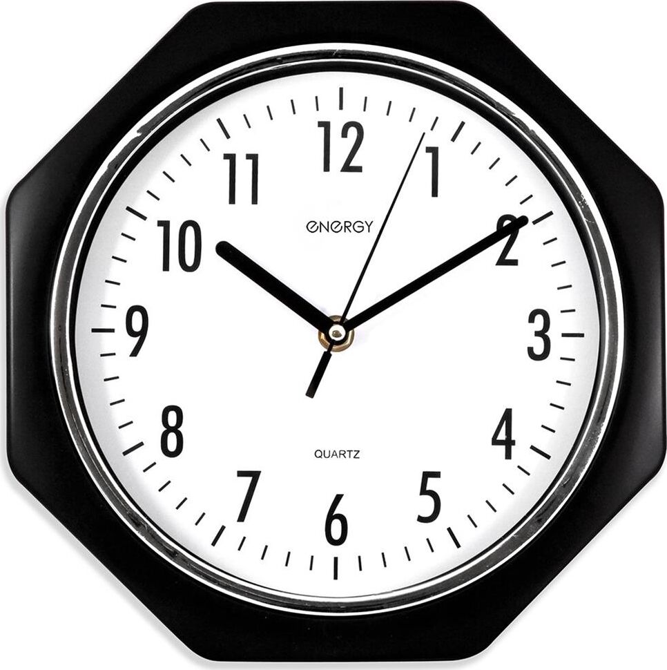 Настенные кварцевые часы Energy модель ЕС-06, восьмиугольные, прекрасно дополнят любой интерьер благодаря классическому черно-белому дизайну. Корпус часов выполнен из прочного пластика. На белом фоне циферблата нанесены крупные арабские цифры для хорошей видимости на расстоянии. Часовой механизм оснащен плавным ходом секундной стрелки.