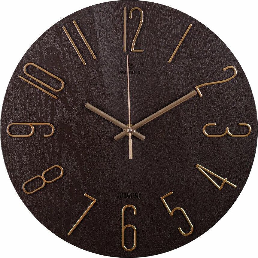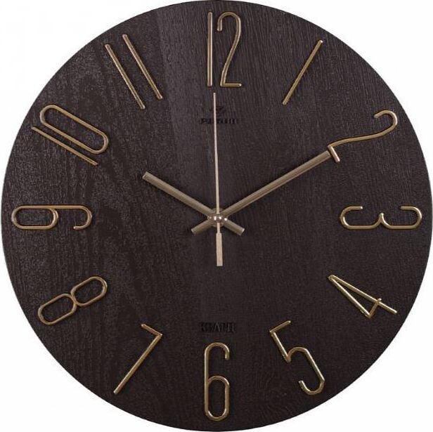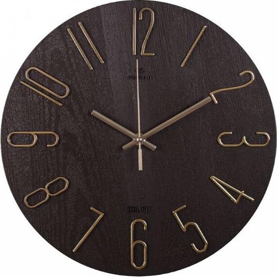 3010-003 (10) Часы настенные d=30см, корпус коричневый+золото "Классика" РАЗМЕР (ДХВХШ) 300х300х20 мм АРТИКУЛ 3010-003 КОЛИЧЕСТВО В КОРОБКЕ 10 МАТЕРИАЛ Пластмасса, металл БАТАРЕЙКА работает от 1 батарейки АА "пальчиковая", в комплект не входит СТРАНА-ПРОИЗВОДИТЕЛЬ Россия ЧАСОВОЙ МЕХАНИЗМ С плавным ходом