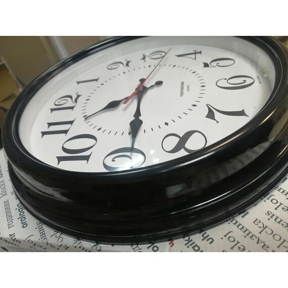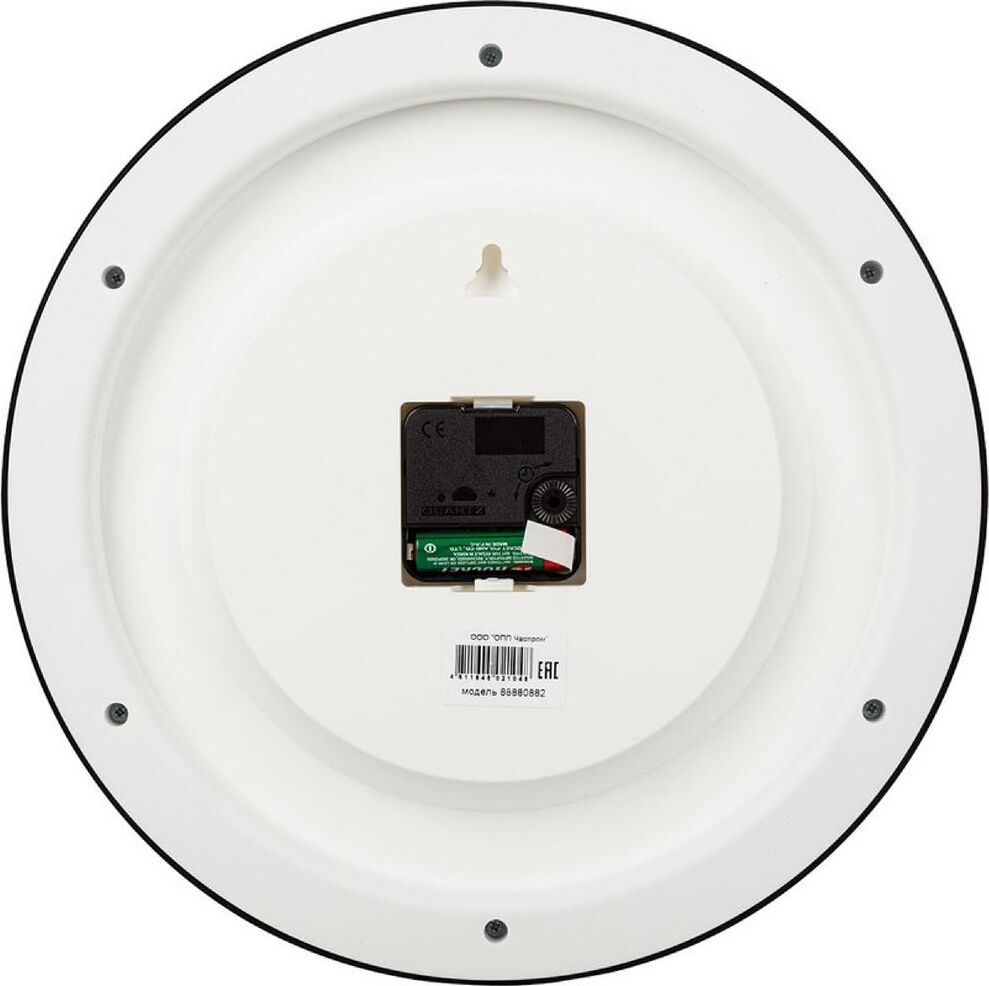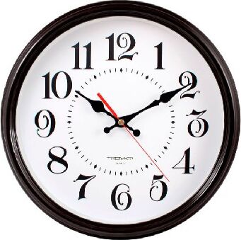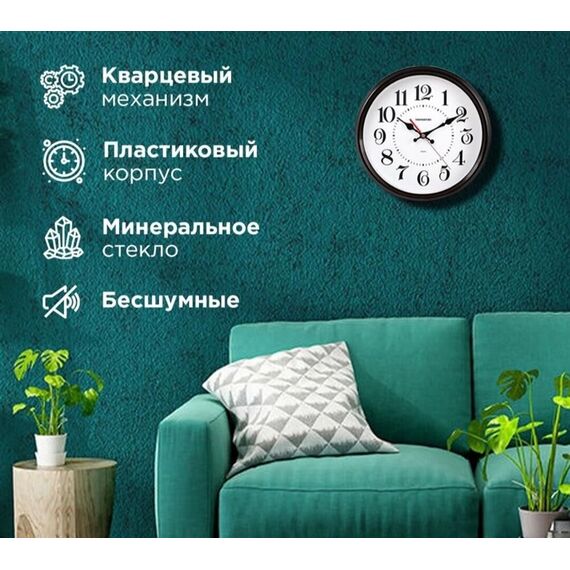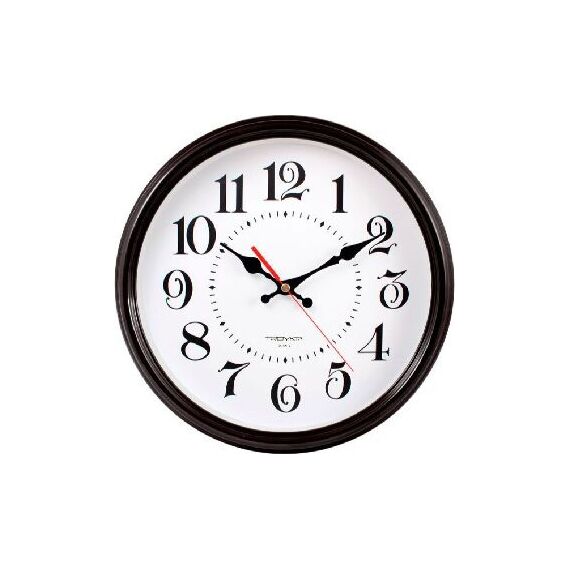 Тип часов: Настенные часы, Диаметр: 310 мм, Корпус: Пластик, Стекло: Минеральное стекло, Механизм: Кварцевый механизм с плавным ходом.