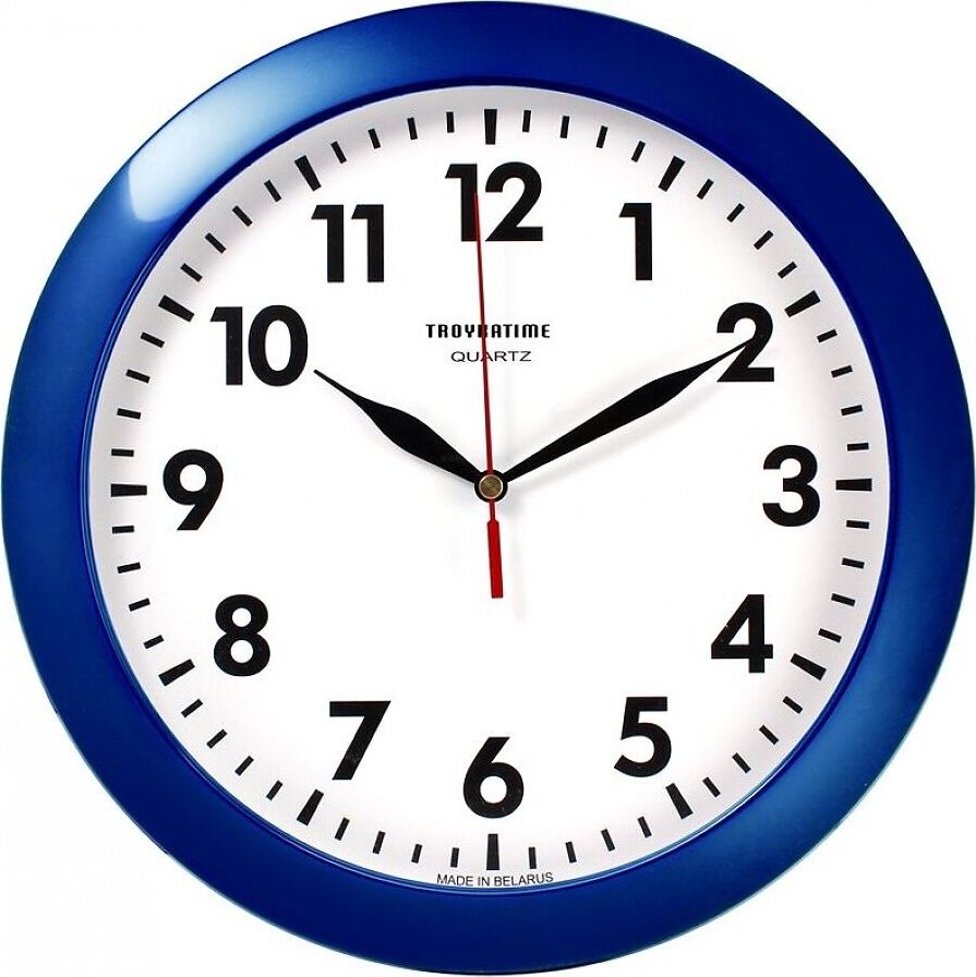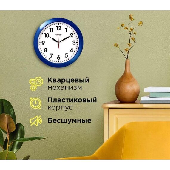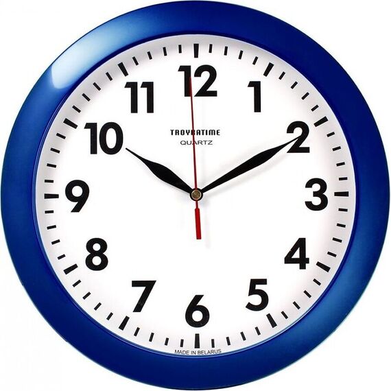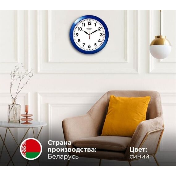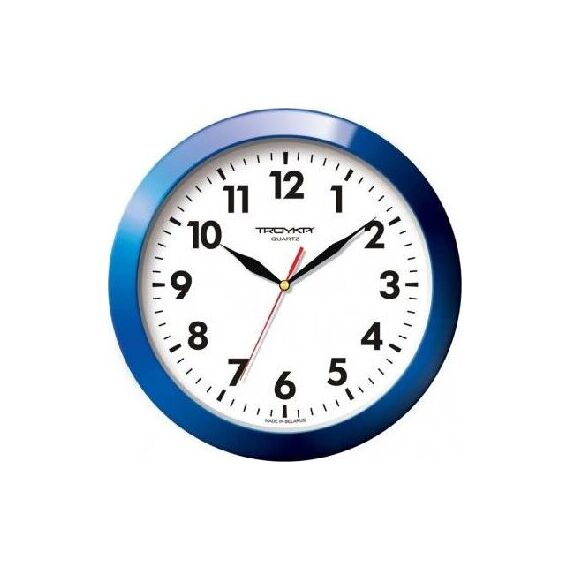 Категория: настенные, Тип механизма: кварцевый, Материал корпуса: пластик, Точный размер корпуса: 290х290х35 мм, Форма корпуса: круглые, Цвет корпуса: синий, Цвет циферблата: белый, Циферблат: стрелочный, Цифры: арабские, Ход: плавный.