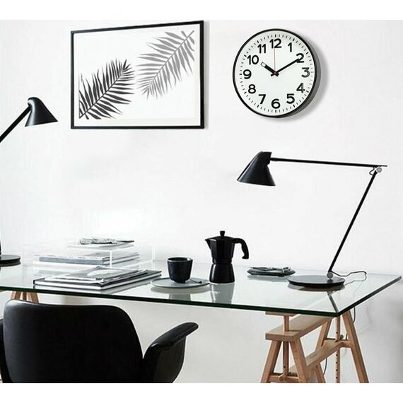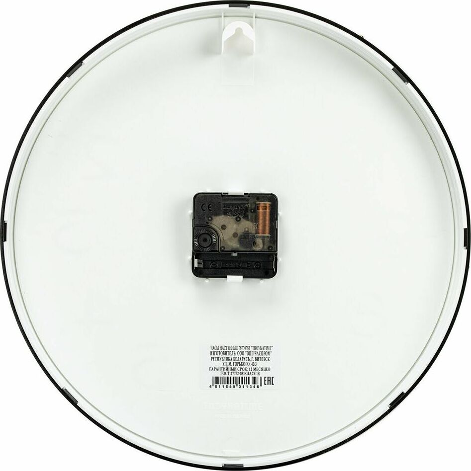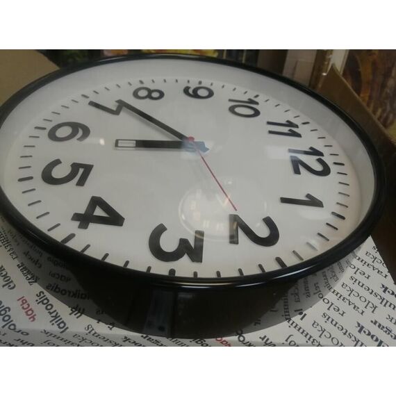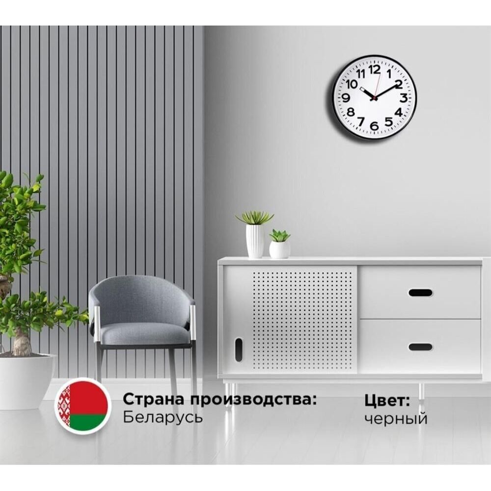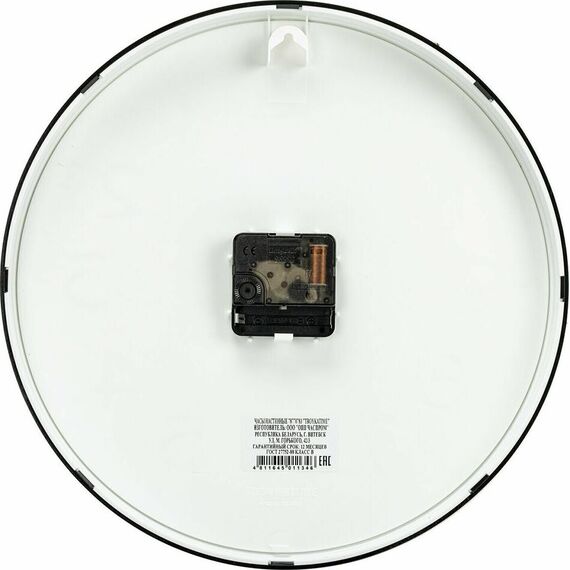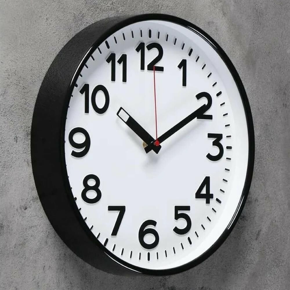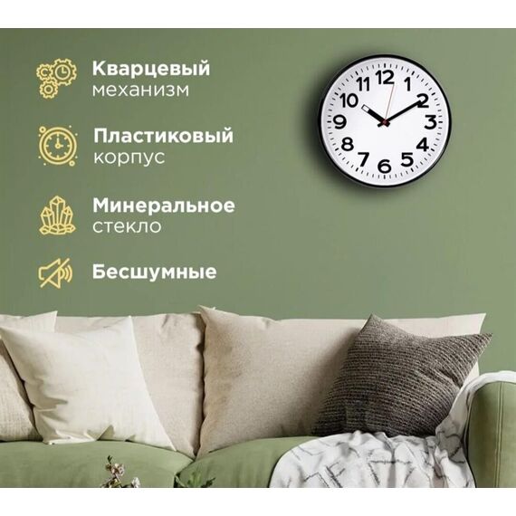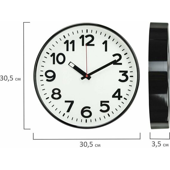 Категория: настенные, Тип механизма: кварцевый, Материал корпуса: пластик, Точный размер корпуса: 300х300х50 мм, Форма корпуса: круглые, Цвет корпуса: черный, Цвет циферблата: белый, Циферблат: стрелочный, Цифры: арабские, Ход: шаговый.