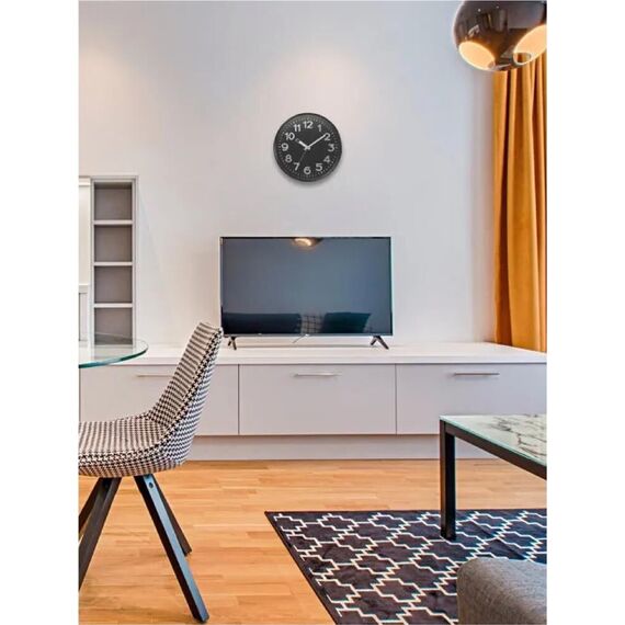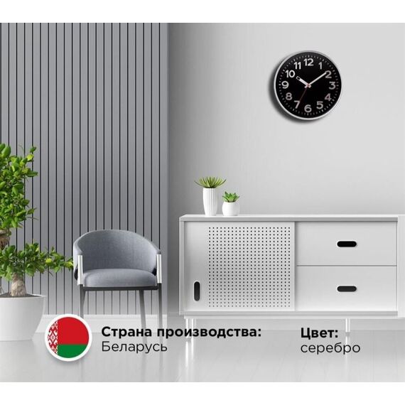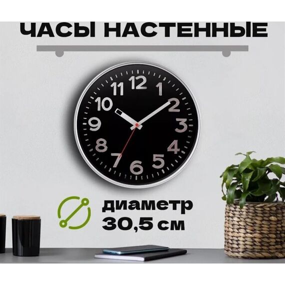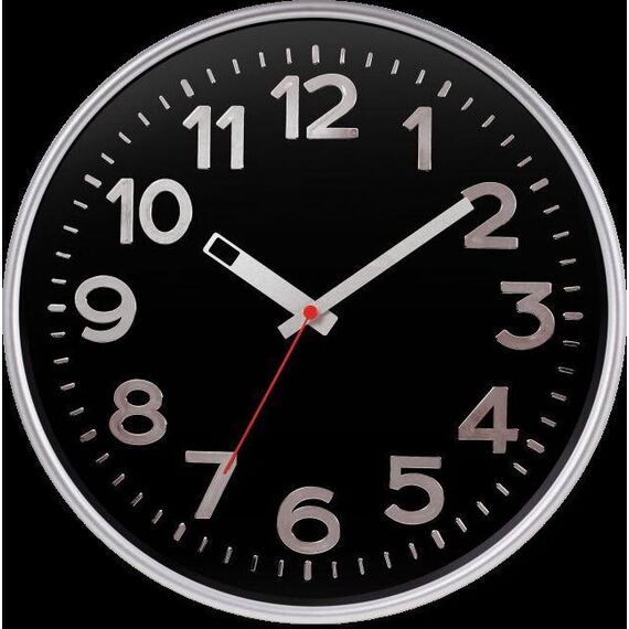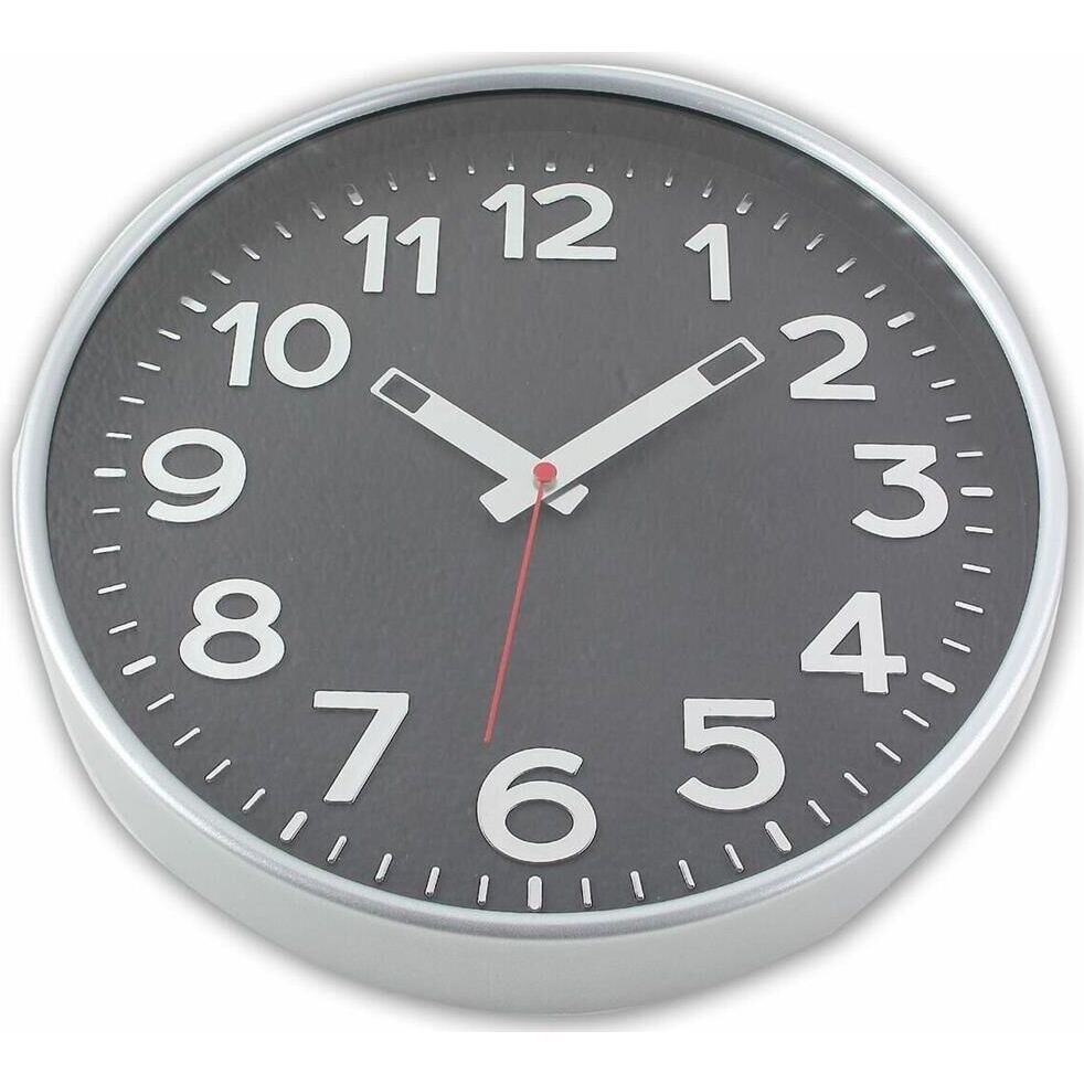 Часы настенные пластиковые, модель 78777782, размер 305*305*50 мм, стекло минеральное, пластиковый обод, цвет-серебро, рельефные цифры с тиснением фольгой под серебро.