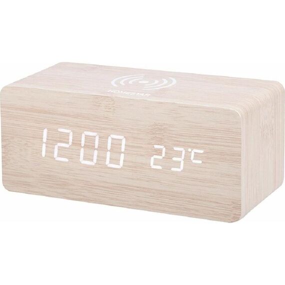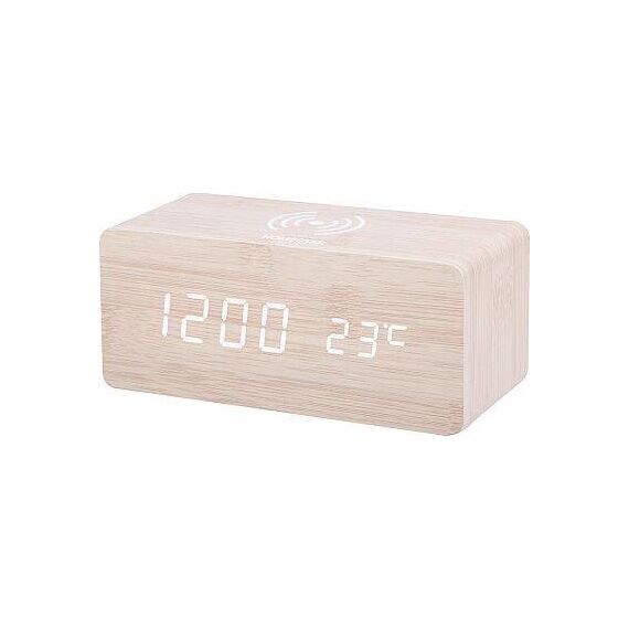 Мощность 6 Вт LCD дисплей Современный дизайн Крупный шрифт Два режима отображения Формат времени 12/24 часа 3 Будильника Показатель температуры (по Фаренгейту и Цельсию) Функция памяти Беспроводная зарядка (Мощность QI5 Вт) Три уровня яркости дисплея Функция энергосбережения Функция перезапуска Работа от USB Напряжение DC 5 В USB шнур в комплекте Работа от батареек 4*AAA (1,5 В) (в комплект не входят) Напряжение 6 В Размер 16х7х7 см Цвет дерево