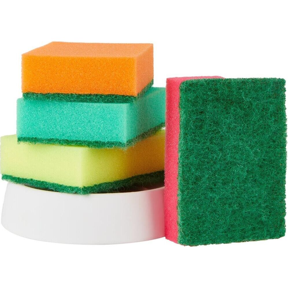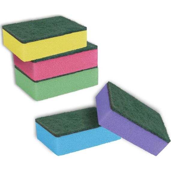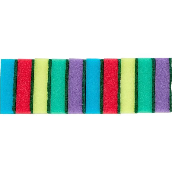 Набор из 10-ти классических двуслойных разноцветных губок для мытья посуды. Губки имеют удобный размер для повседневного использования. Отлично пенят моющее средство. Грубый слой отчищает самые стойкие загрязнения и не истирается. Состав: полиуретан, фибра. Размер одной губки: 9х6х2,9 см.