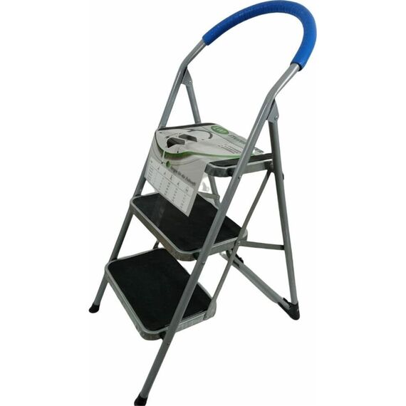 Стремянка оснащена удобной ВЫСОКОЙ ручкой С ПРОРЕЗИНЕНОЙ НАСАДКОЙ и резиновыми протвоскользящими насадками на ножках и ковриками на ступеньках высота ступеньки 71 см, вес 6,1кг