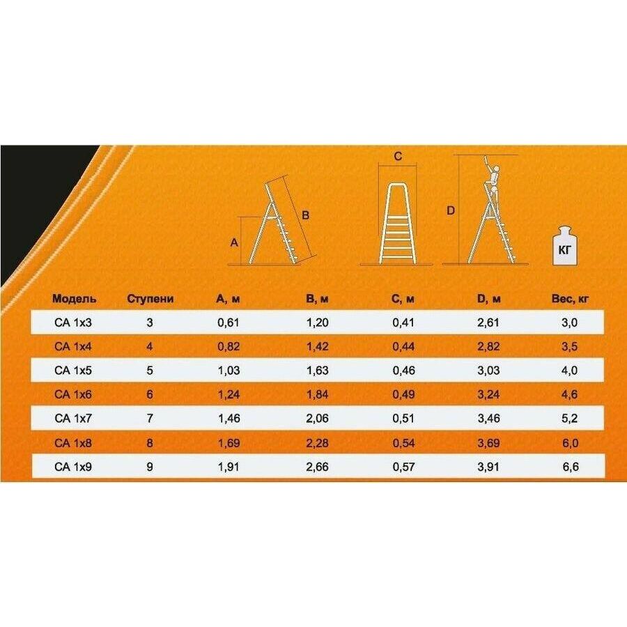 Алюминиевая стремянка Вихрь СА 1х5 73/5/1/3 пригодится в любой ситуации. Изготовлена из алюминия, что гарантирует высокую прочность и долговечность. Ступени с рифленой поверхностью не позволят скользить во время работы стоящему на них человеку. Прочные страховочные ленты предотвращают выход стремянки из рабочего положения. Высота площадки, м 1,03. Размер в сложенном состоянии, см 172х47. Количество ступеней, шт 5. Материал алюминий. Кол-во ступеней по одной стороне, шт 5. Max рабочая нагрузка, кг 150. Тип стремянка. Общая длина, м 1,72. min длина в сложенном состоянии, м 1.72. Широкие ступени да. Телескопическая/выдвижная нет. Ширина ступеней, мм 80. Ширина лестницы, мм 470. Лоток для принадлежностей нет. Анодированная нет. Вес нетто, кг 3,6. Габариты без упаковки, мм 1720х470. Толщина профиля, мм 0.8-1.