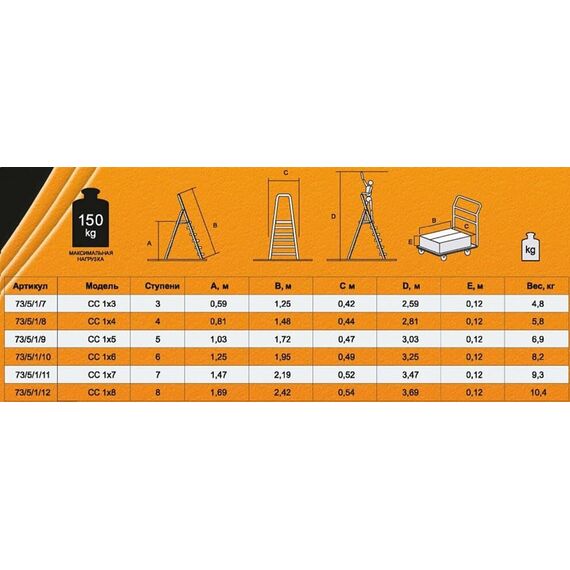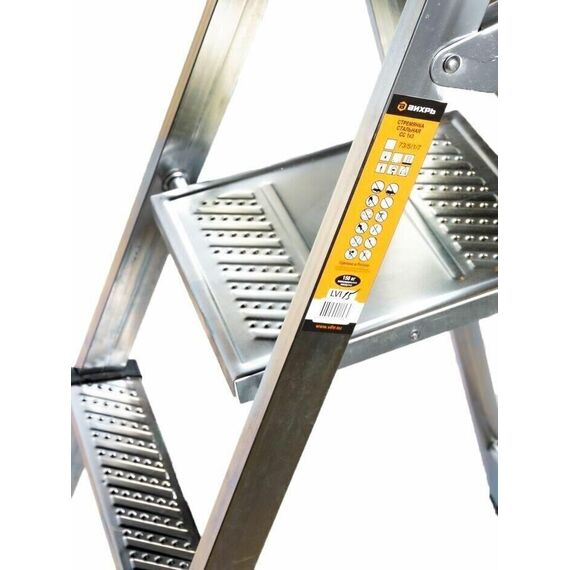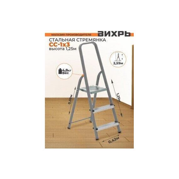 Стальная стремянка Вихрь СС 1х3 73/5/1/7 используется в быту. Имеет три широкие рифленые ступеньки. Широкая площадка позволяет удобно стоять и выполнять работу. В сложенном состоянии модель занимает мало места, что удобно при хранении. Устойчивость обеспечивается противоскользящими заглушками. Рабочая высота, м 2,59. Высота площадки, м 0,64. Размер в сложенном состоянии, см 106х42. Количество ступеней, шт 3. Материал сталь. Max рабочая нагрузка, кг 150. Общая длина, м 1,06. Кол-во ступеней по одной стороне, шт 3. min длина в сложенном состоянии, м 1,06. Широкие ступени да. Телескопическая/выдвижная нет. Ширина лестницы, мм 420. Лоток для принадлежностей нет. Тип стремянка. Вес нетто, кг 4,5. Габариты без упаковки, мм 1060х420. Толщина профиля, мм 0.8-1.