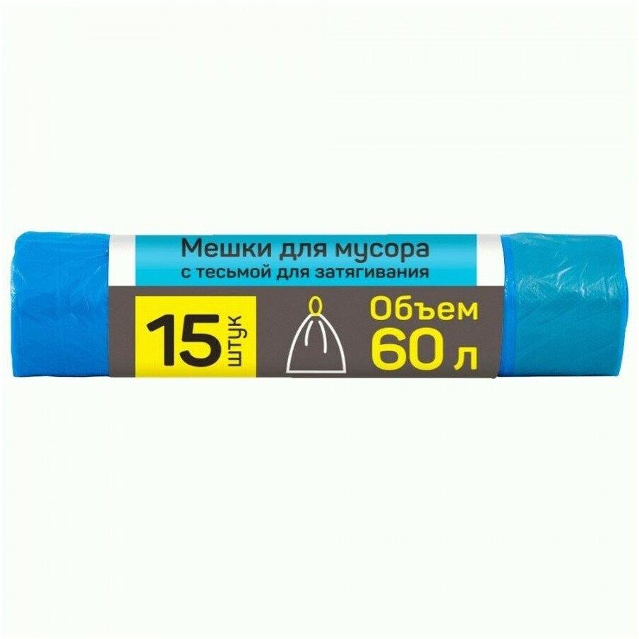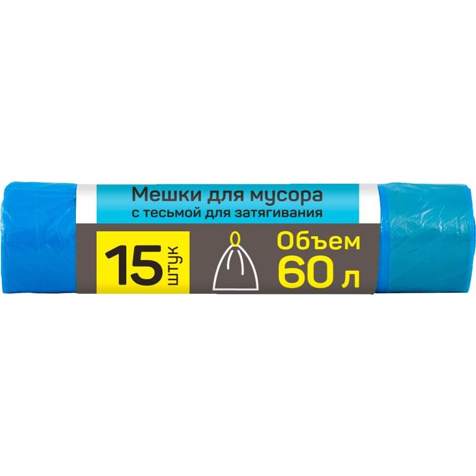 Мешки для мусора. Размер мешка 59х67см.Плотность 16,3 микрон. Цвет - синий. Объем 60 литров. Количество в индивидуальной упаковке 15 штук. Состав: полиэтилен HDPE 2. Для пищевых и непищевых отходов. Срок годности не ограничен.
