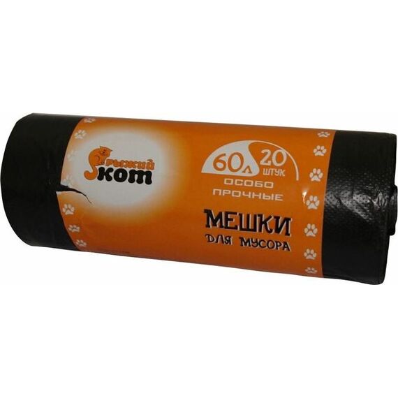 РЫЖИЙ КОТ мешки для мусора особо прочные 60л 20шт/рул. (20) ПНД (черные), размер мешка длина 695мм, ширина 600мм, плотность 18мкм. Материал: полиэтилен низкого давления.