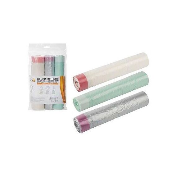 Набор из 3х рулонов В рулоне: 15 штук Размер: 50*60см Плотность: 15 мкм, с завязками Объем: 35 литров Материал: полиэтилен низкого давления Цвет: серый, мятный, бежевый