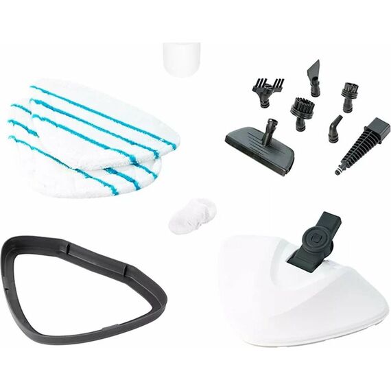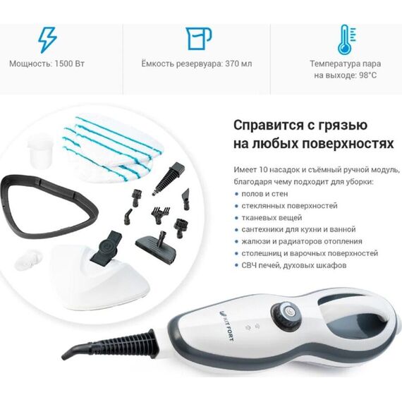 Тип Паровая швабра. Мощность 1500 Вт. Управление на корпусе. Резервуар для воды 0.37 л. Время разогрева 30 с. Регулировка подачи пара есть. Длина сетевого шнура 5 м. Область применения: полы и стены, стеклянные поверхности, тканевые вещи, сантехника для кухни и ванной, жалюзи и радиаторы отопления, столешницы, варочные поверхности, СВЧ печи, духовые шкафы. Цвет белый/черный. Размеры (ШхВхГ) 33х118.5х24 см.