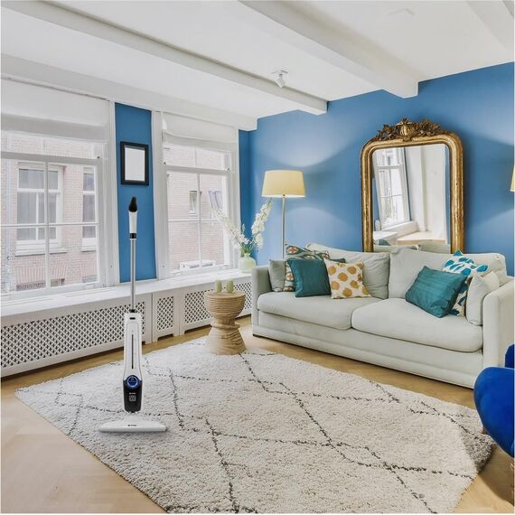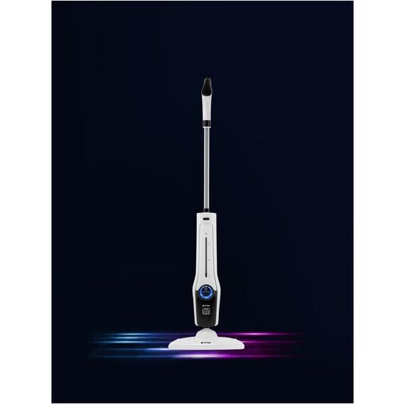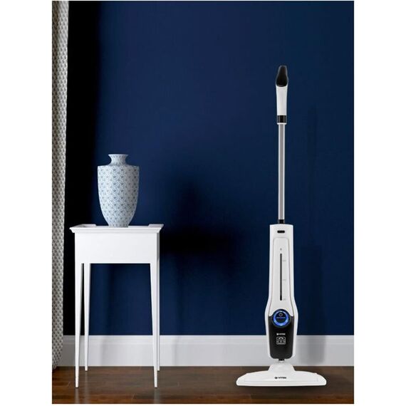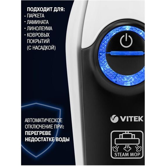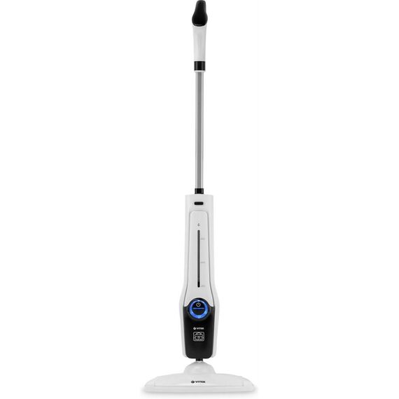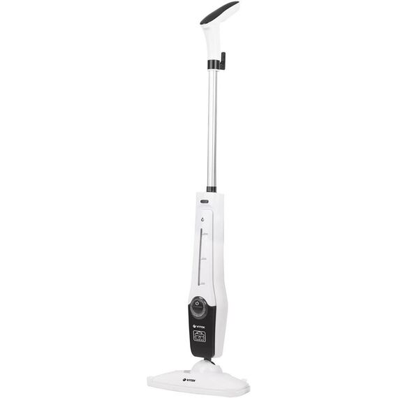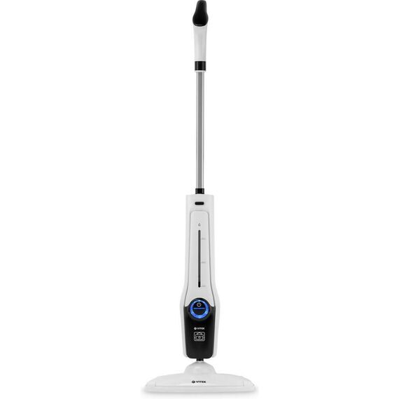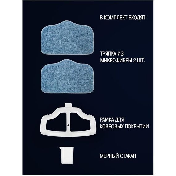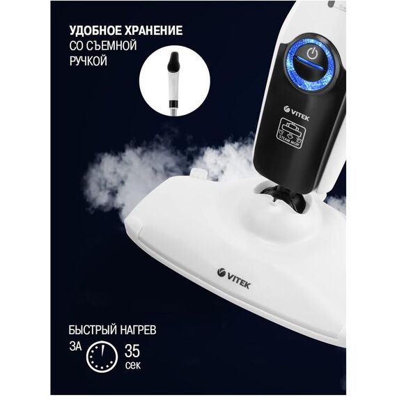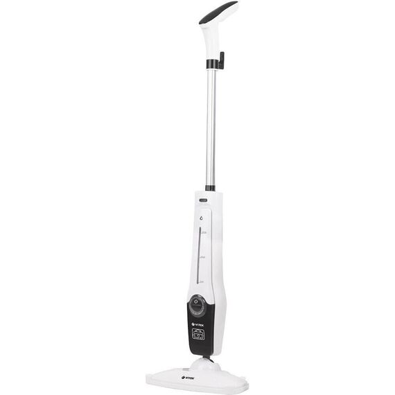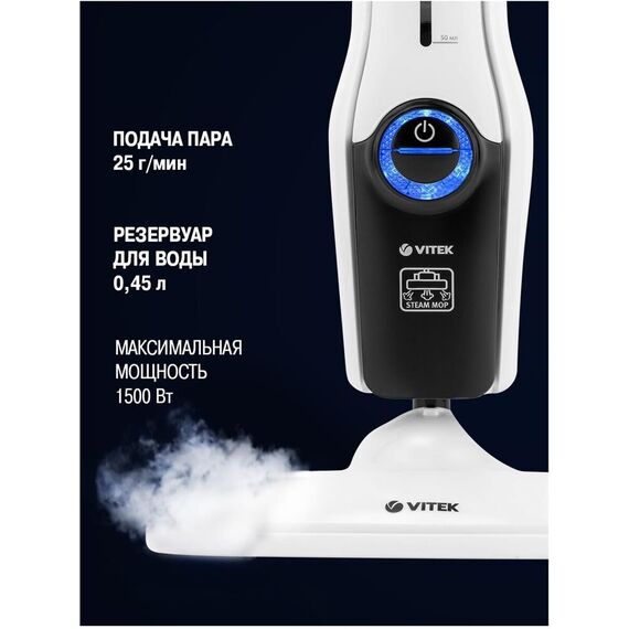 Паровая швабра. Максимальная мощность: 1500 Вт, Время разогрева: 35 секунд, Объем резервуара для воды: 0,45 литра, Подача пара: 25 г/мин., Съемная ручка, Фильтр для воды, Длина сетевого шнура: 4,7 метра, Номинальная мощность: 1300 Вт, Цвет: Белый/черный