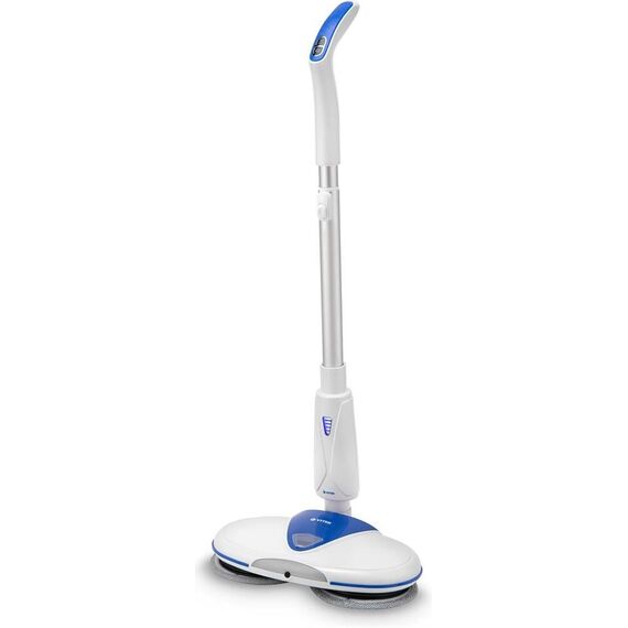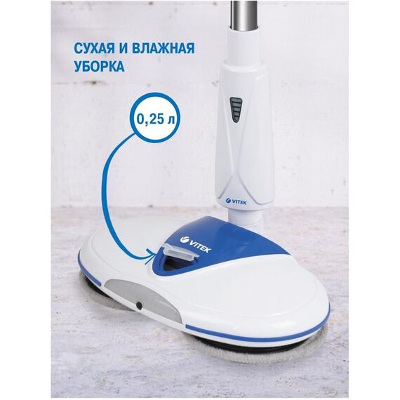 Электрошвабра. Максимальная мощность: 50 Вт, Время работы от аккумулятора: 25-45 минут, Время зарядки аккумулятора: 4 часа, Материал трубки: алюминий, Индикатор уровня заряда, Разбрызгиватель для воды: механический, Скорость вращения: 180 об/мин., Объем резервуара для воды: 0,25 литра, Площадь уборки: 90-100 м2, Питание: Аккумуляторная батарея, Электропитание: 11,1 В 2200 мАч, Цвет: Белый/синий