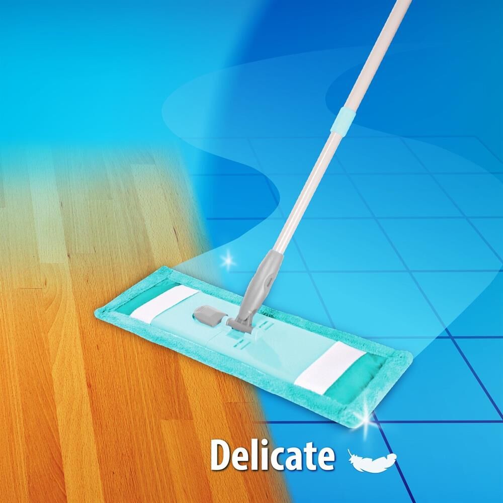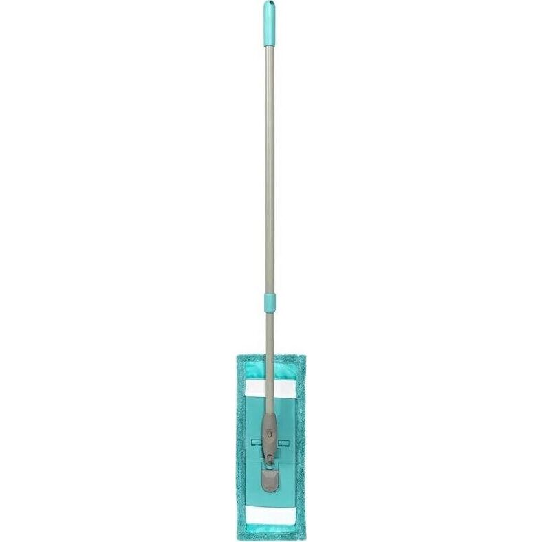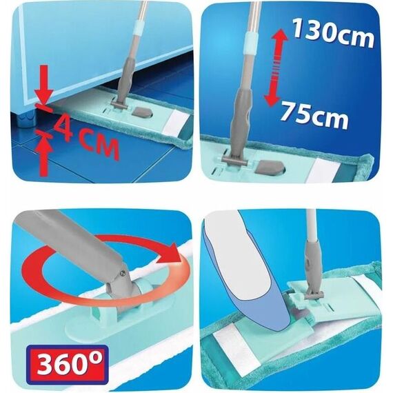 Швабра предназначена для влажной уборки пола. Идеально подходит для уборки квартир до 100 кв.м. Швабра оснащена телескопическим механизмом, что позволяет выбрать комфортную длину для вашего роста минимальная длина 75 см, максимальная длина 130 см. Платформа швабры вращается на 360 градусов, а равномерный прижим платформы к полу позволяет делать уборку без разводов. Насадка швабры из микрофибры обладает хорошей способностью впитывать и удерживать воду, легко отжимается, не впитывает запахи, прочно крепится к платформе с помощью «карманов» и выдерживает до 600 циклов уборки. Насадку можно стирать в стиральной машинке при температуре 60 градусов. На ручке швабры есть петля для подвеса на крючок, что позволяет хранить ее компактно.