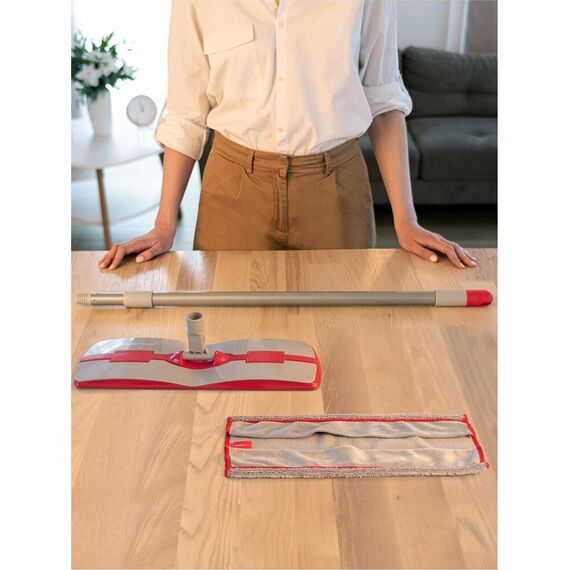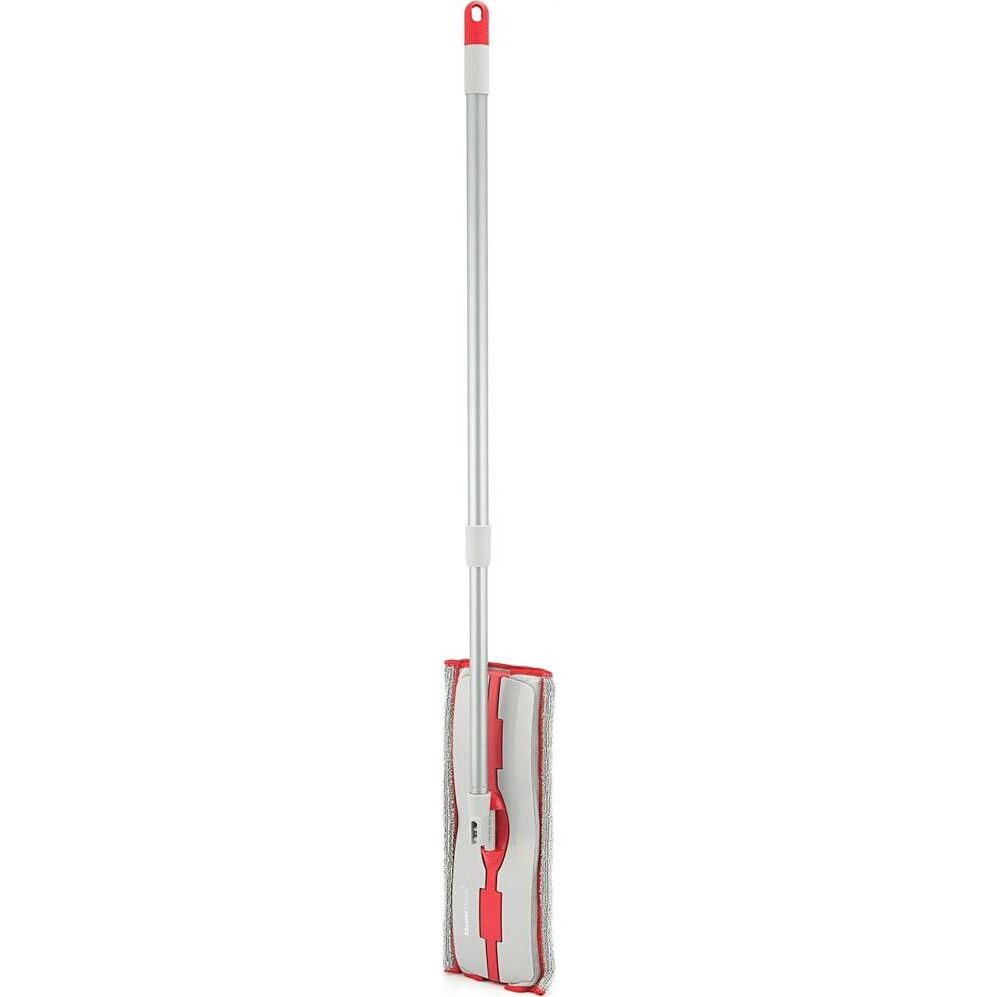 Швабра с телескопической металлической окрашенной ручкой, длина ручки 78-128см, вес 340г, основание 38х12см, 250г, с микрофибровой рабочей частью 40х20см, вес 55г, состав сталь, полипропилен, этиленвинилацетат, микрофибра (80% полиэстер, 20% полиамид) цвет: серо-красный, индивидуальная упаковка: картонный подвес, LDPE пакет, 12шт./тр. кор.