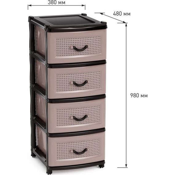 Изделие способно гармонично вписаться в интерьер любой комнаты. Комод произведен из высококачественного и безопасного полипропилена. Комод имеет четыре выдвижных ящика большой вместимости, в которых будет очень удобно хранить личные вещи и другие принадлежности. Вес 4.393 кг. Размеры изделия (ДхШхВ) 480х380х980 мм.