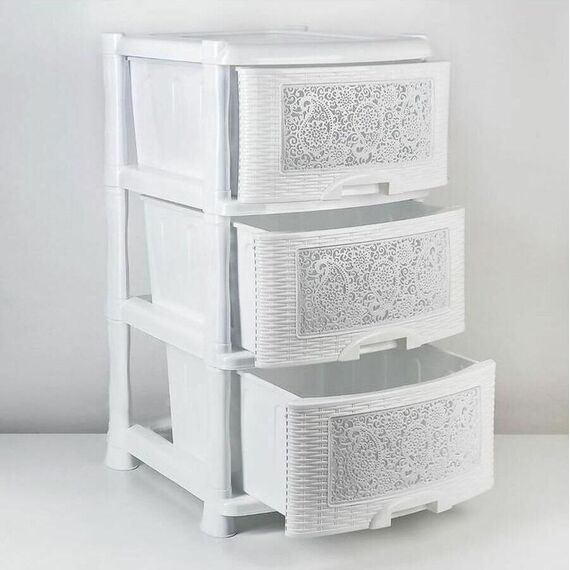 Цвет белый. Размер 470 x 390 x 730 мм. Материал Полипропилен. Комод из пищевого пластика с тремя выдвижными ящиками предназначен для хранения вещей и продуктов питания и гармонично впишется в интерьер любой комнаты. Легкий и вместительный комод поможет обеспечить порядок, избавит от разбросанных игрушек или одежды, убережет продукты от пыли и заветривания. Узор на передних панелях придаст индивидуальность и подарит настроение. Не рекомендуется размещение пластикового комода вблизи батарей центрального отопления и электрических обогревателей.