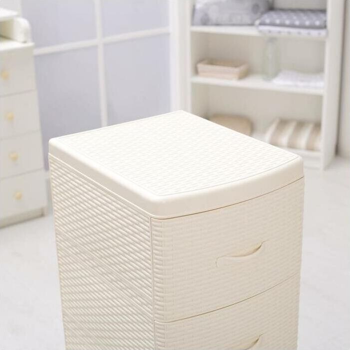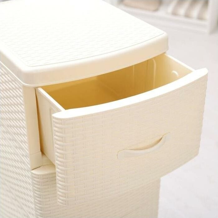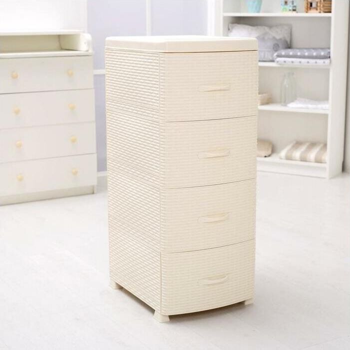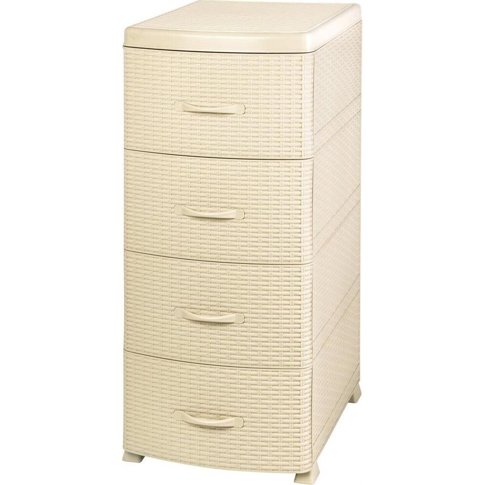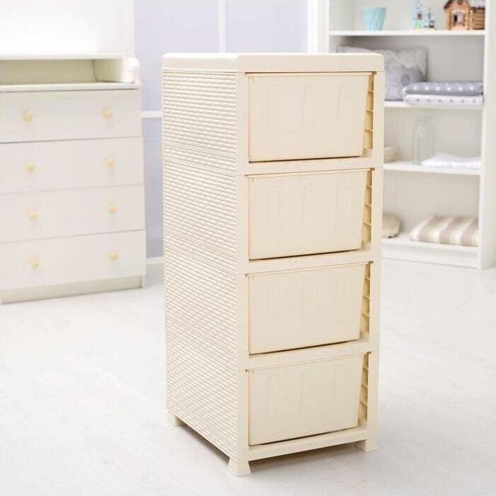 Цвет слоновая кость. Размер 480 х 380 х 960 мм. Материал Полипропилен. Комод из пищевого пластика с четырьмя выдвижными ящиками предназначен для хранения вещей и продуктов питания и гармонично впишется в интерьер любой комнаты. Легкий и вместительный комод поможет обеспечить порядок, избавит от разбросанных игрушек и одежды, убережет продукты от пыли и заветривания. Текстура с имитацией натурального плетения «Ротанг» привнесет уют в ваш интерьер и придаст индивидуальность. Не рекомендуется размещение пластикового комода вблизи батарей центрального отопления и электрических обогревателей.