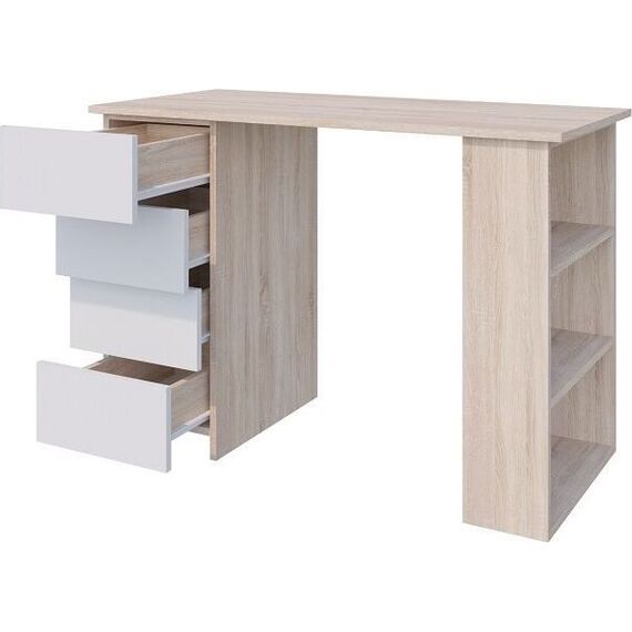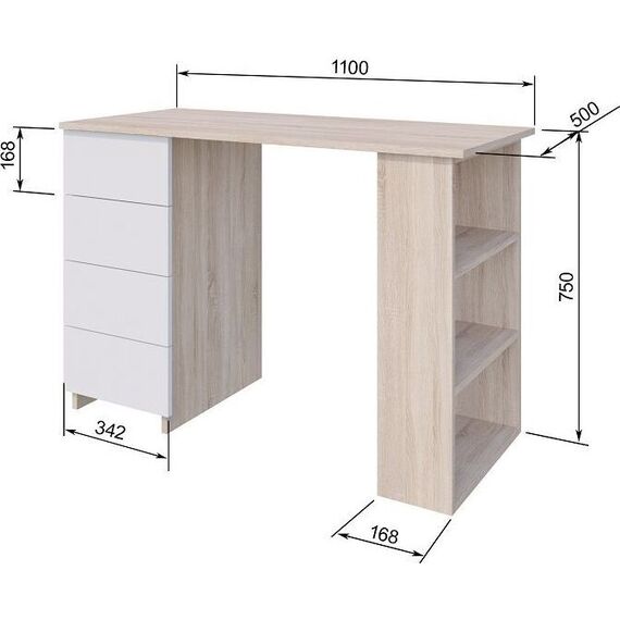 Стол письменный СП-05 создан для комфортной учебы и работы за компьютером. Благодаря своим компактным размерам и современному дизайну стол отлично впишется в интерьер любого дома или офиса. Стол оснащен четырьмя выдвижными ящиками, в которых удобно хранить канцелярские принадлежности и документы. Открытый стеллаж под столешницей прекрасно подойдет для книг и органайзеров. Возможна сборка на правую и левую сторону. Размеры: Ш*В*Г (1100*750*500) мм. Материал каркаса: ЛДСП Дуб сонома Материал фасада: ЛДСП Белый Направляющие ящиков: роликовые Срок службы (мес.) 120. Гарантия (мес.) 24. Стол можно дополнить шкафом для документов исп.1 из коллекции Найс.