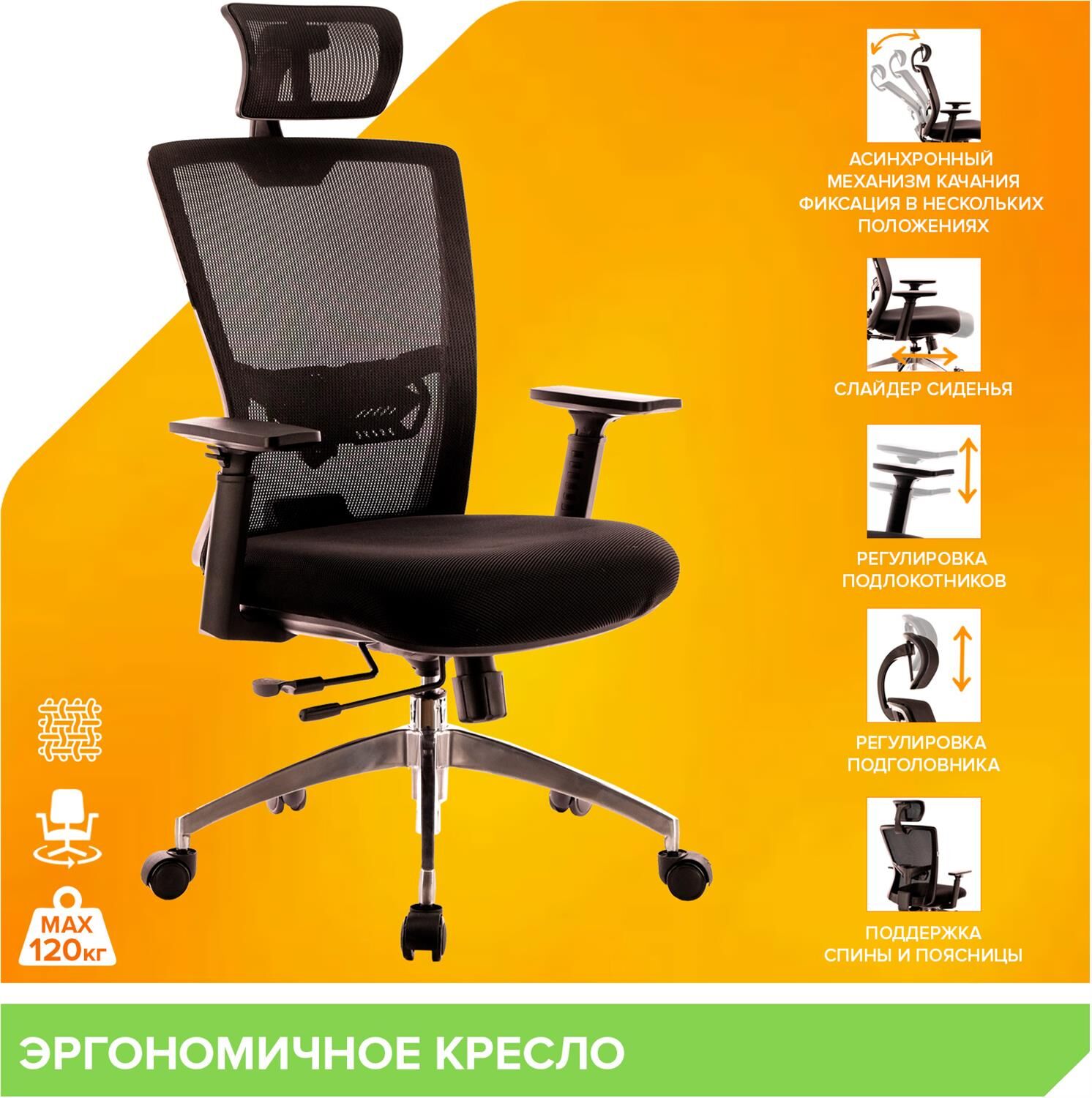 Цвет Черный. Газ патрон Да. Каркас Немонолитный. Материал обивки Сетка. Механизм качания Механизм качания с асинхронным отклонением сидения и спинки в соотношении 1:3, а также фиксацией кресла в нескольких положениях. Sipro механизм регулировки глубины сидения. Тип основания Крестовина алюминиевая. Подголовник Регулируемый. Подлокотники Регулируемые пластиковые с накладками из мягкого полиуретана. Ролики Для паркета. Диаметр штока 11 мм. Поясничная поддержка Регулируемая по высоте. Материал набивки Вспененный полиуретан плотностью 22-25 кг/куб.м Тип Эргономичное. Допустимая нагрузка 120 кг. Рост до 170см/Рост 170 - 185см/Рост 185 - 200см. Максимальная высота (всего кресла) 1230мм. Минимальная высота (всего кресла) 1150мм. Ширина 650мм. Минимальная высота сиденья 440мм. Ширина сиденья 500мм. Глубина сиденья 520мм. Минимальная высота до подлокотников 610мм. Вес, нетто 16.5кг. Вес, брутто 18.5кг.
