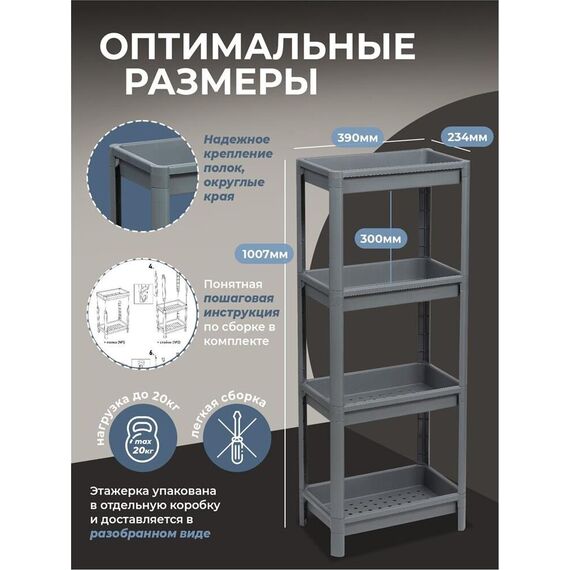 Материал: полипропилен. Цвет: серый. Количество полок: 4 шт. Наличие колес: нет. Ширина: 234 мм. Высота: 1007 мм. Глубина: 390 мм.