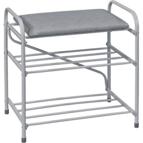 Банкетка-этажерка для обуви 2-х ярусная с мягким сиденьем. ЦВЕТ: серый. РАЗМЕР ИЗДЕЛИЯ: 340 x 480 x 520 мм. МАТЕРИАЛ: металл + полипропилен + тканый материал.