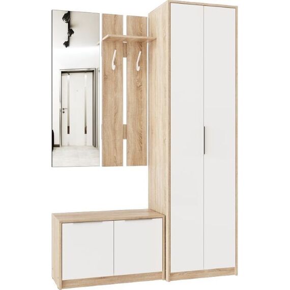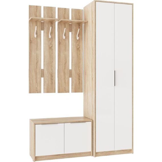 Тумба для обуви низкая Нордик выполнена в стиле минимализма. Сочетание декоров натурального дерева и белого цвета подчеркнет современный стиль Вашего интерьера. Компактные размеры позволяют разместить тумбу даже в небольших прихожих, создавая уют и порядок. В тумбе удобно хранить высокую обувь. Гармонично тумба будет смотреться в сочетании с другими элементами прихожей Нордик. Материал каркаса: ЛДСП дуб сонома. Материал фасадов: ЛДСП белый. Ручки: металл. Коллекция Нордик. размеры: ШхВхГ (803х490х360)мм. Цвет фасадов Белая Аляска. Цвет каркасов Дуб сонома светлый. Материал фасадов ЛДСП. Материал каркасов ЛДСП. Тип мебели Тумба для обуви. Срок службы (мес.) 120. Гарантия (мес.) 24.