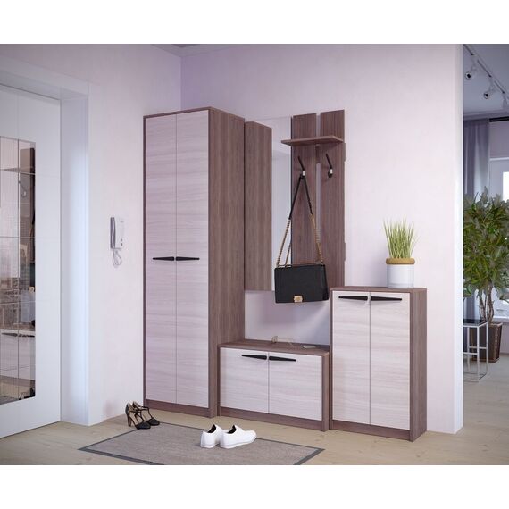 Тумба для обуви высокая Оптима выполнена в стиле минимализма. Сочетание декоров темного и светлого дерева подчеркнет современный стиль Вашего интерьера. Компактные размеры позволяют разместить тумбу даже в небольших прихожих, создавая уют и порядок. На четырех полках можно легко расместить до восьми пар обуви, а также удобно хранить средства для ухода за ней. Тумба будет очень гармонично смотреться в сочетании с другими элементами коллекции Оптима. Материал каркаса: ЛДСП шимо темный Материал фасадов: ЛДСП шимо светлый Ручки: пластик. Размеры: В*Ш*Г (900*535*300)мм. Изготовлено из ЛДСП 16 мм, торцы облицованы кромкой ПВХ 0,4мм в цвет материала. Цвет фасадов Шимо светлый Цвет каркасов Шимо темный Материал фасадов ЛДСП Материал каркасов ЛДСП Тип мебели Тумба Срок службы (мес.) 120 Гарантия (мес.) 24