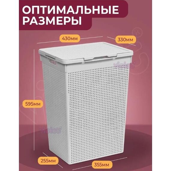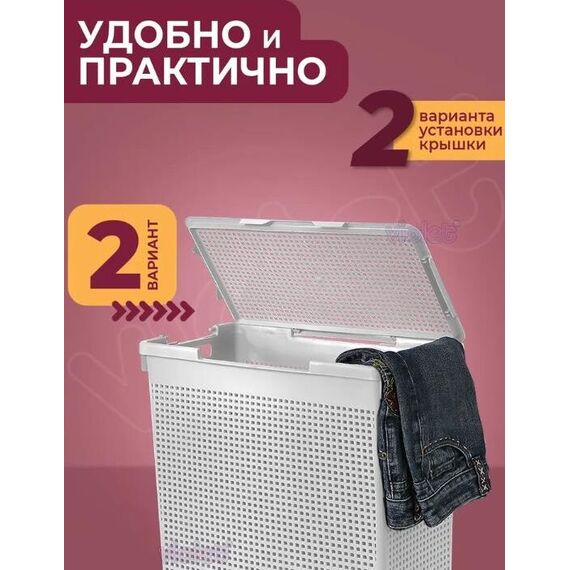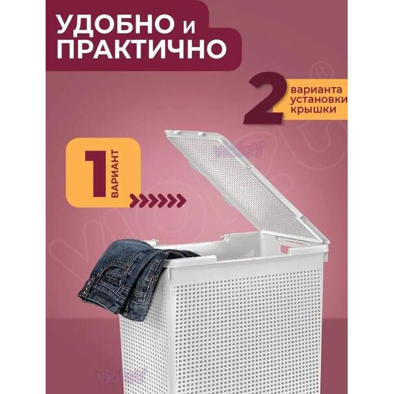 Корзина для белья "Лофт" с крышкой 60л (белый) Встречайте новинку от бренда Виолет в серии Лофт - корзина для белья с крышкой, объемом 60 литров. В ней мы объединили все самое лучшее - стильный дизайн с перфорацией стенок и крышки для хорошей вентиляции, оптимальный объем и удобные габариты, и самая главная особенность корзины - два варианта открытия крышки. Ее можно переставлять как Вам удобнее и открывать бак либо с торцевой, либо с фронтальной стороны.