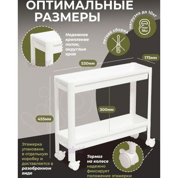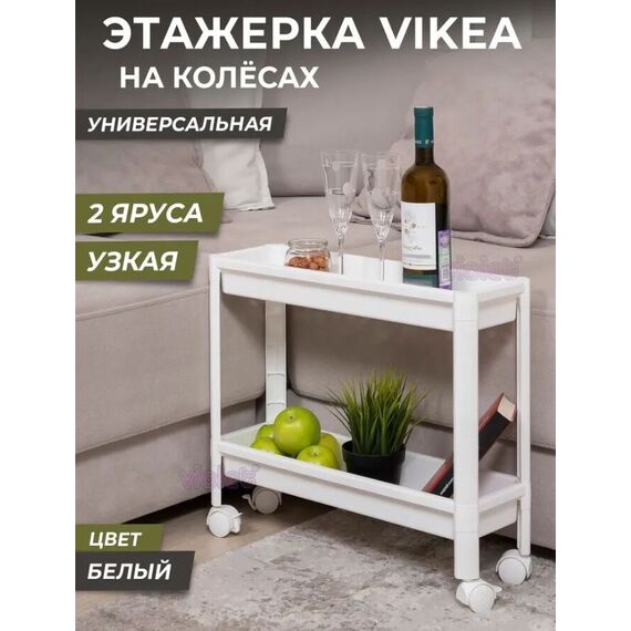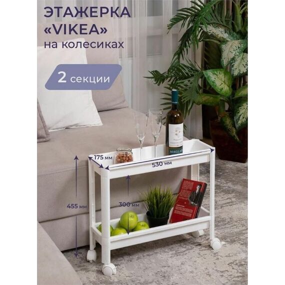 Размер этажерки - 530х175х455мм. Этажерка для хранения вещей VIKEA - это идеальное решение для организации пространства на Вашей кухне и в ванной, в гостиной и на балконе, а также в любом другом помещении. Этажерка для кухни состоит из 2х ярусов, очень удобная и компактная, но в тоже время вместительная, прекрасно впишется в пространство любой комнаты. Стеллаж имеет оптимальное расстояние между полками. Это позволяет разместить все самые необходимые полезные в хозяйстве мелочи. Стойки сконструированы таким образом, что при вхождении их в полку создаётся надёжное соединение внутренним замком, что обеспечивает монолитность конструкции и дает возможность поднять и переместить этажерку за верхнюю полку.