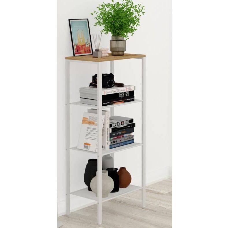 Изделие предназначено для хранения домашних и офисных предметов. Представляет собой стеллаж с 4 полками, выполненными из просечно-вытяжного листа и верхней полки из ЛДСП. Разборный каркас состоит из стальной профильной трубы 15х25 мм. В комплект входят регулируемые пластиковые опоры. Все изделие окрашено однотонной, порошковой краской. Допустимая нагрузка на полки до 8 кг. Габариты (Д*Ш*В) — 47 х 30 х 114 см