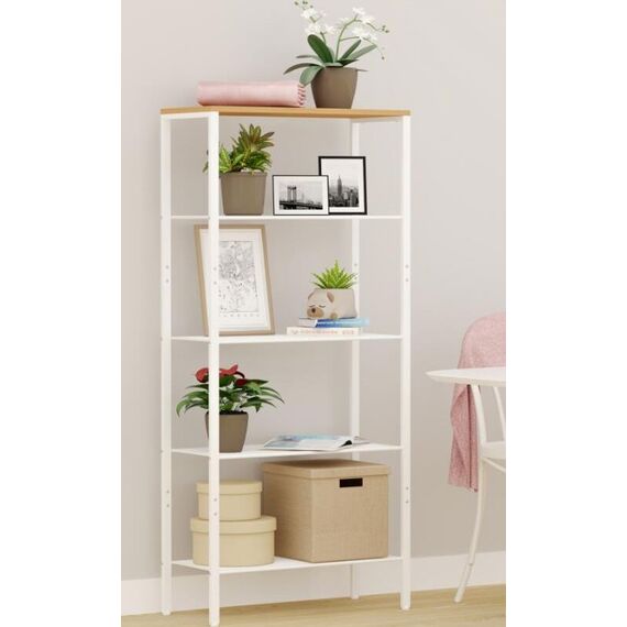 Изделие предназначено для хранения домашних и офисных предметов. Представляет собой стеллаж с 5 полками, выполненными из просечно-вытяжного листа и верхней полки из ЛДСП. Разборный каркас состоит из стальной профильной трубы 15х25 мм. В комплект входят регулируемые пластиковые опоры. Все изделие окрашено однотонной, порошковой краской. Допустимая нагрузка на полки до 8 кг.Габариты (Д*Ш*В) — 67 х 30 х 146,5 см