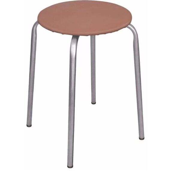 На 4-х опорах, мягкое круглое сидение, легко штабелируются, материал сиденья прочный, устойчивый к истиранию и легкий в чистке, пластиковые колпачки на ножках защищают поверхность пола от царапин, допустимая нагрузка не более 100кг , каркас - стальная труба, сиденье - винилискожа, основание - МДФ, колпачки на ножках - пластик.