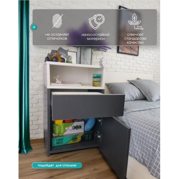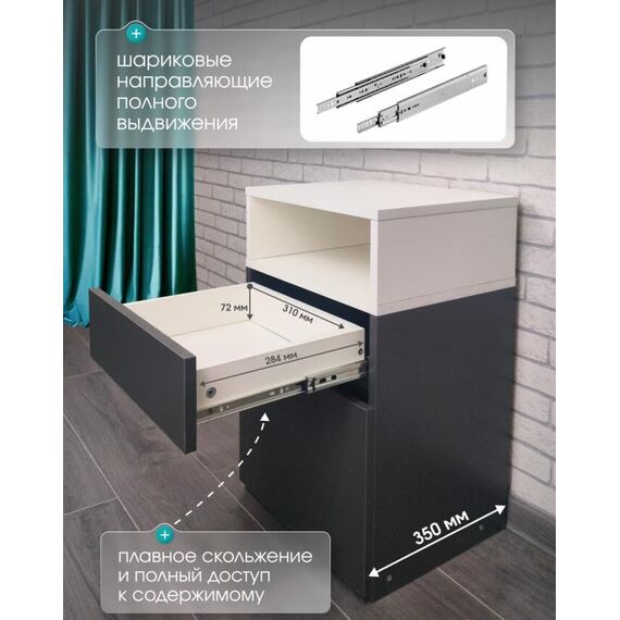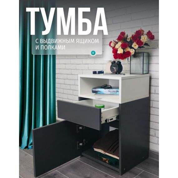 Представляем вам универсальную тумбу, которую можно расположить как в напольном варианте, так и как подвесную на стену. Лаконичные формы и простота линий делают её актуальной для многих пространств. Эта модель предоставляет возможность хранения самых необходимых вещей прямо у вас под рукой. Наполнение: 1 ящик, 1 Дверка, Открытая ниша/полка. Выдвижной ящик оснащен шариковыми направляющими. Материал корпуса: ЛДСП. Возраст: Взрослый. С замком: Нет. Наполнение: 1 ящик, Дверки, Открытая ниша/полка. Вид: Напольная. Поставляется в разобранном виде: Да. Размеры: ШхГхВ (400х350х634)мм. Цвет: Антрацит/Белый.