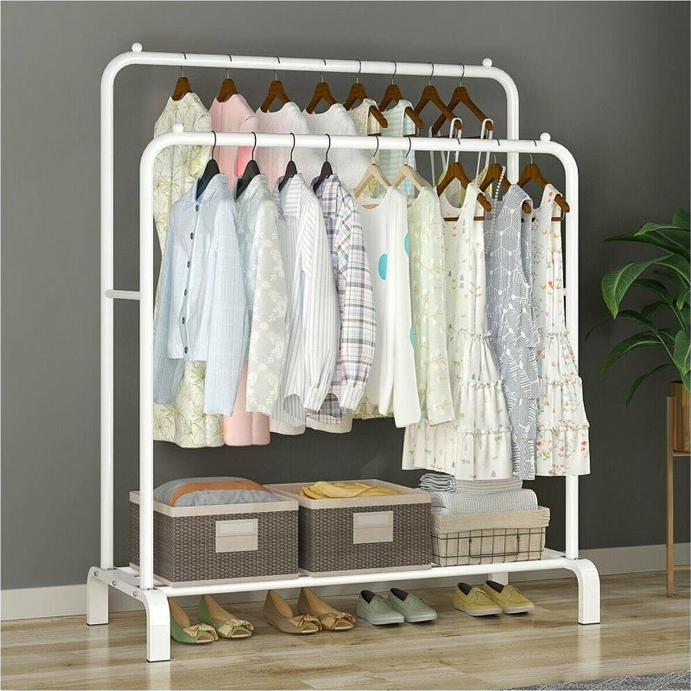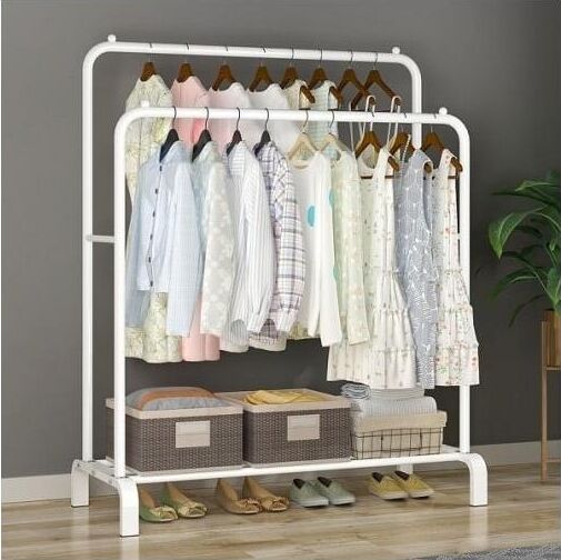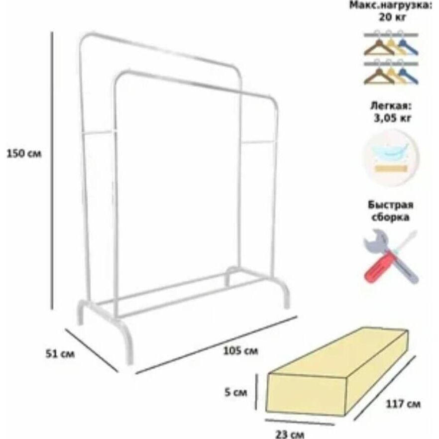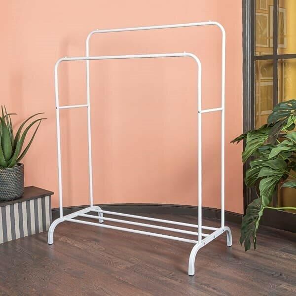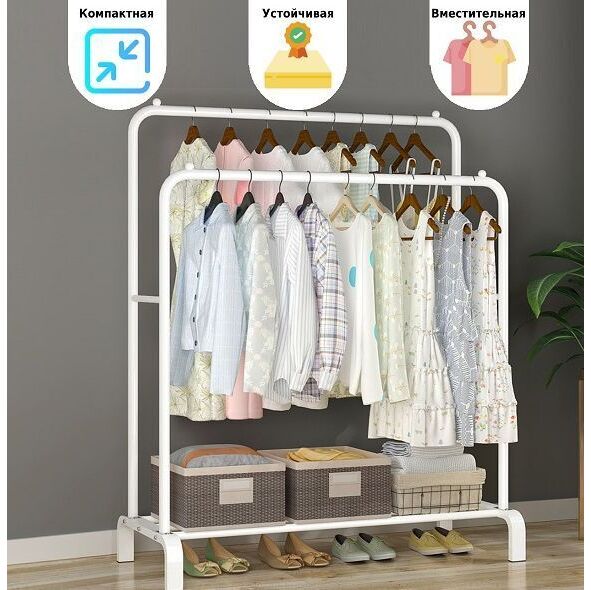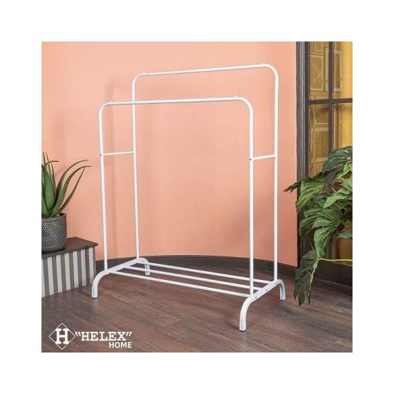 Двойная напольная вешалка подойдет как для хранения одежды, так и для удобного хранения сумок, рюкзаков и других аксессуаров. Нижняя полка вешалки, расположенная у пола, позволит удобно разместить шесть пар обуви, либо станет удачным местом для хранения органайзеров или коробок. Штанга вешалки вмещает большое количество одежды, а удобные стопперы не позволят вешалкам падать на пол, тем самым сохраняя одежду чистой. Напольная вешалка очень легко монтируется и собирается без лишних инструментов. Размер в сборе: 110х56х147 см • Материал: стальная труба с порошковым покрытием Ø 19 мм / Ø 18 мм, квадратная стальная труба с порошковым покрытием Ø 25 мм • Цвет: белый • Максимальная нагрузка: 20 кг • Количество в коробке: 1 штука • Вес нетто: 3,05 кг • Размер коробки: 117х23х5 см • Вес брутто: 3,3 кг • Производитель: Helex • Страна: Китай