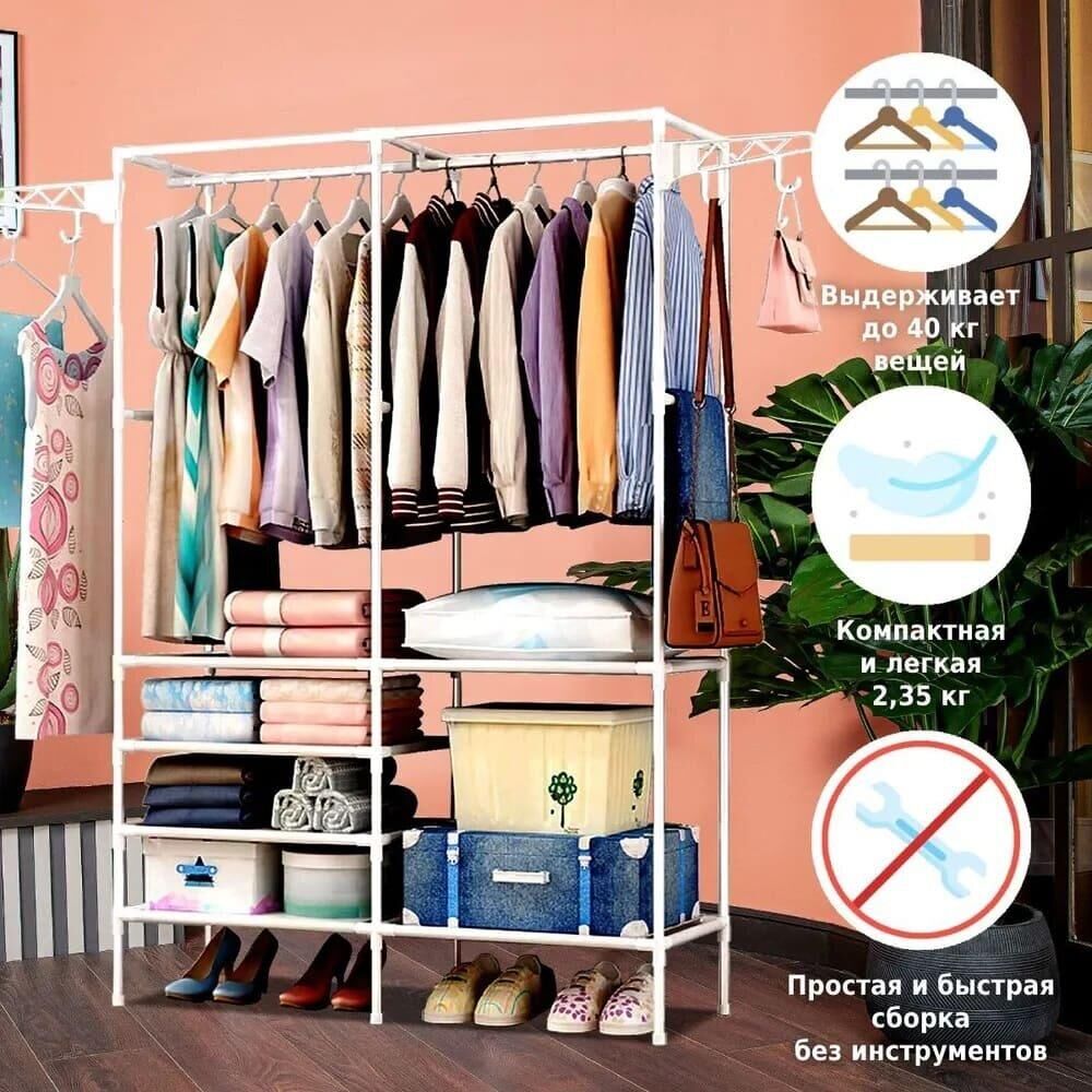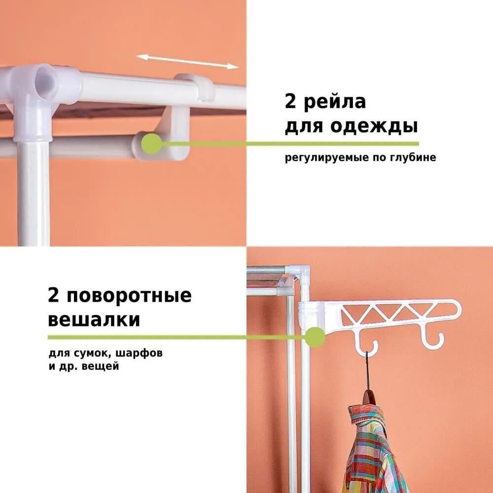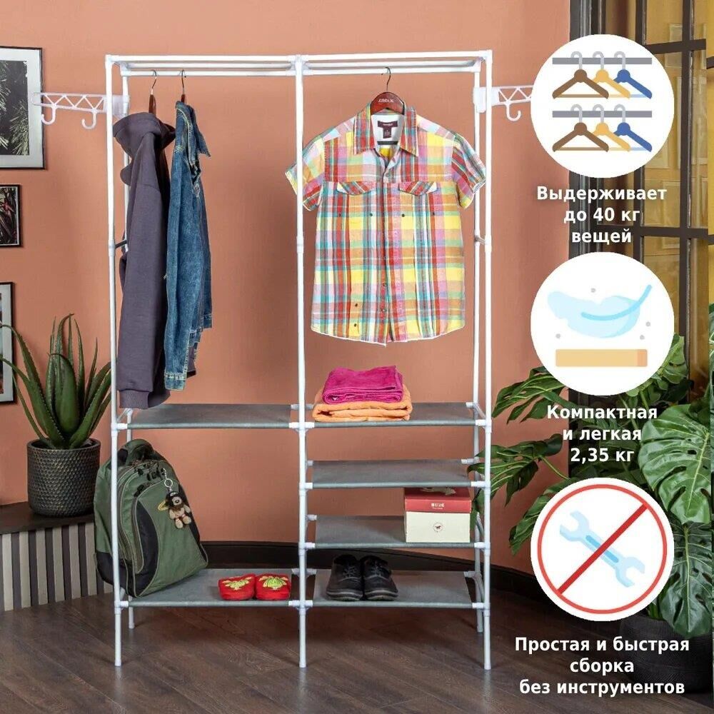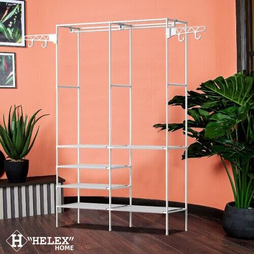 Простая и легкая двойная напольная вешалка с крючками позволит хранить все необходимые вещи рядом. Вмещает в себя большое количество вещей, позволяя грамотно вписать ее в любое пространство. Боковые вращающиеся крючки можно использовать для хранения сумок, шапок, а также мелких аксессуаров. • Размеры в сборе: 108x36x174,5 см • Материал: стальная труба Ø 16 мм (толщина 0,2 мм), полипропилен, нетканый материал с водоотталкивающим покрытием. • Цвет трубы: белый • Цвет ткани: серый • Количество полок: 6 • Максимальная нагрузка: 40 кг • Вес нетто: 2,35 кг • Размер индивидуальной коробки: 55x8,5x34 см • Вес брутто: 2,65 кг • Количество в коробке: 5 штук • Размер транспортной коробки: 57,5x42,5x36,5 см • Вес брутто транспортной коробки: 14,10 кг • Производитель: Helex Home • Страна: Китай
