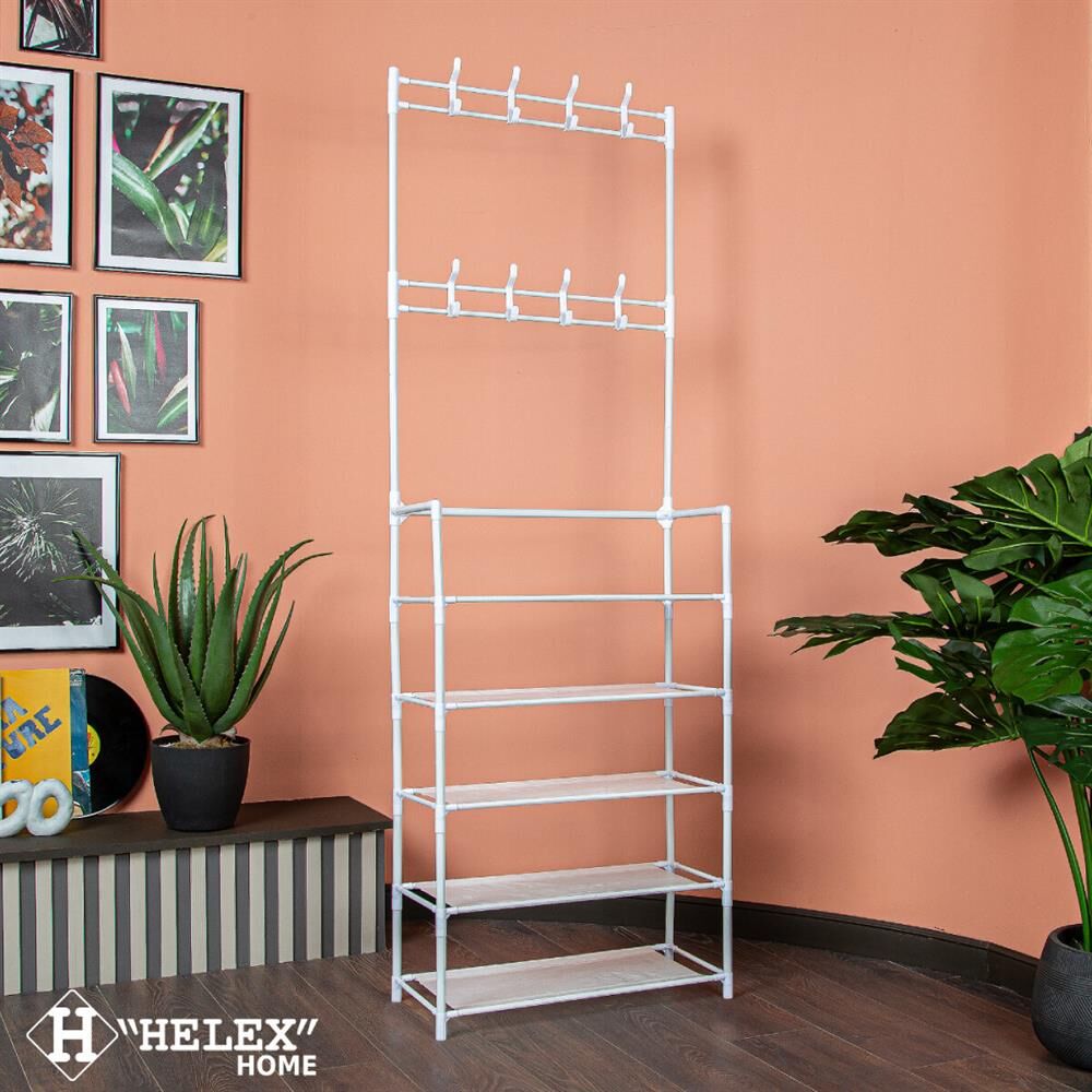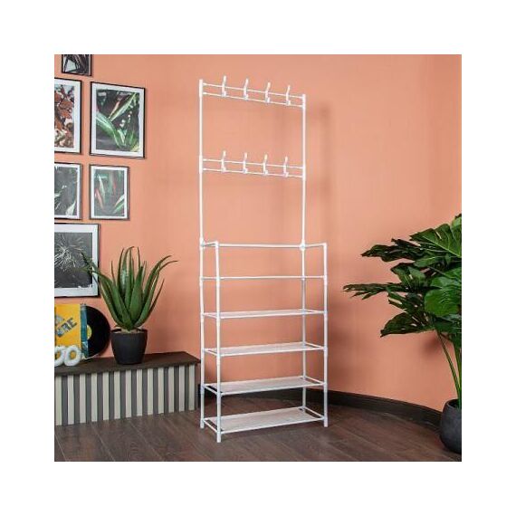 Напольная вешалка с крючками и полками для обуви подойдет к любому интерьеру. С помощью нее вы сможете удобно хранить верхнюю одежду, вещи и обувь. В комплекте идут 8 пластиковых крючков , которые легко крепятся к штангам вешалки вверху . Полки из нетканого материала. Размеры в собранном виде: 170*26*60 см Материал: Металлическая труба 16*0,2 мм, нетканое волокно Цвет трубы: белый Цвет ткани: белый Количество полок: 5 Максимальная нагрузка: 20 кг Вес нетто штуки: 1,3 кг Вес брутто штуки: 1,6 кг Размеры индивидуальной упаковки: 59*19*6 см Размеры транспортной коробки: 61*32*41 см Количество в транспортной коробке: 10