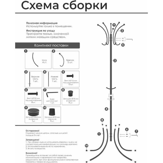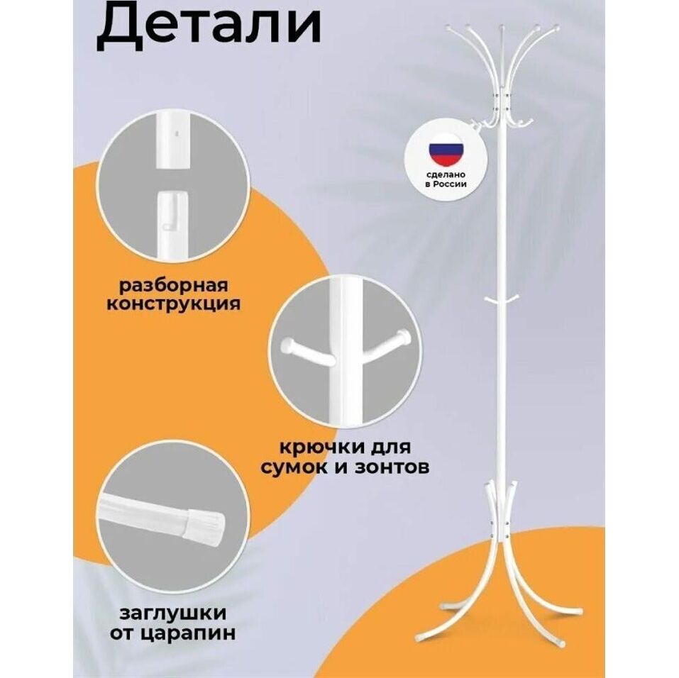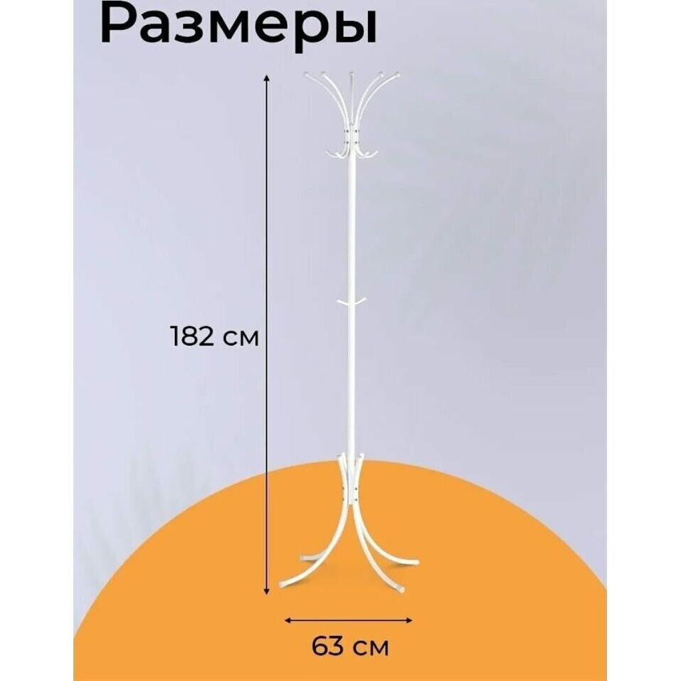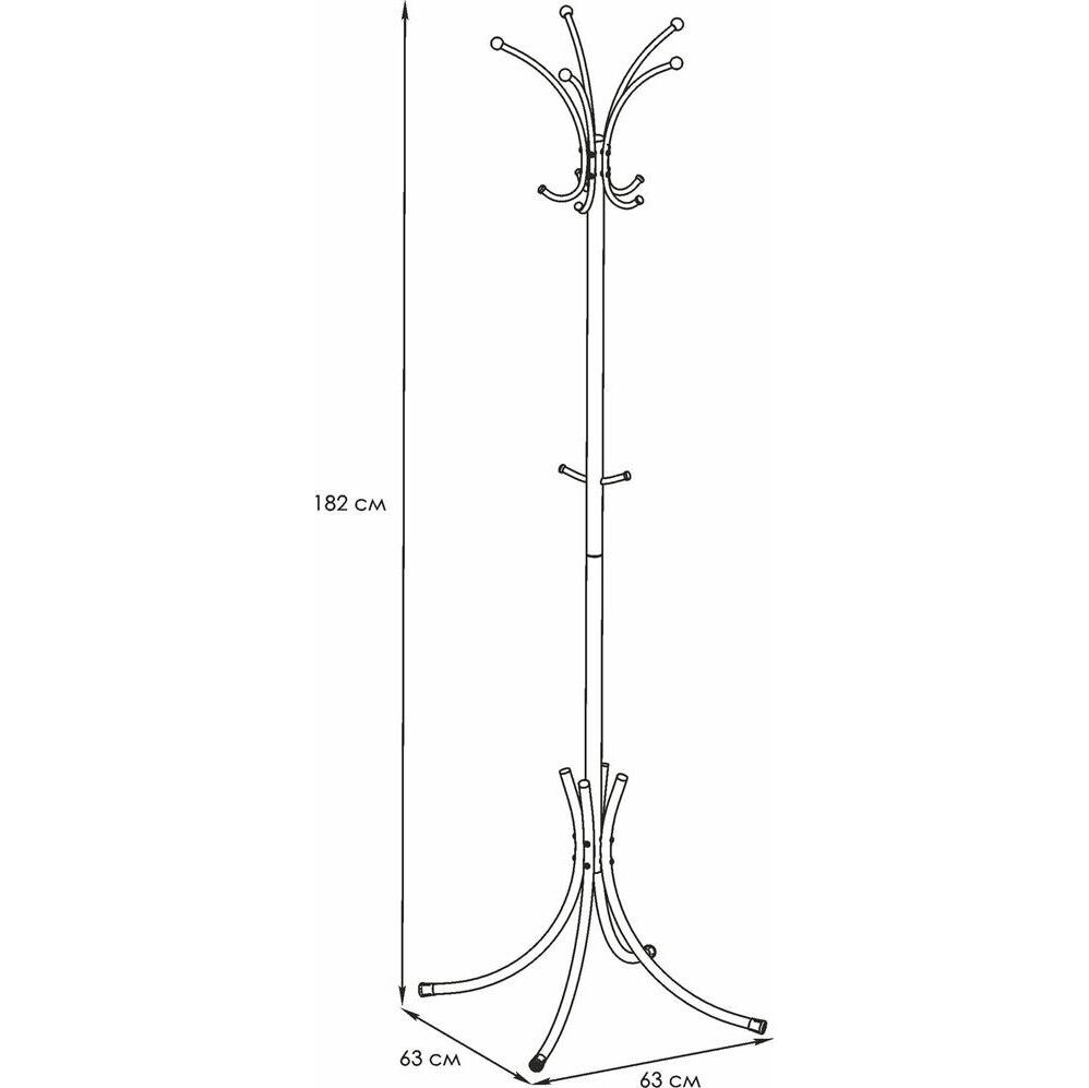 Цельносварная металлическая конструкция. - при равномерном размещении на крючки можно повесить большое количество одежды. - внутри верхней части вешалки между крючками удобно размещаются перчатки, шапки и т.п.. - допустимая нагрузка на крючок 4 кг. - общая допустимая 35 кг. Материал Сталь, полимерное покрытие, пластик. Габариты (Д*Ш*В) 63х63x182 cм.