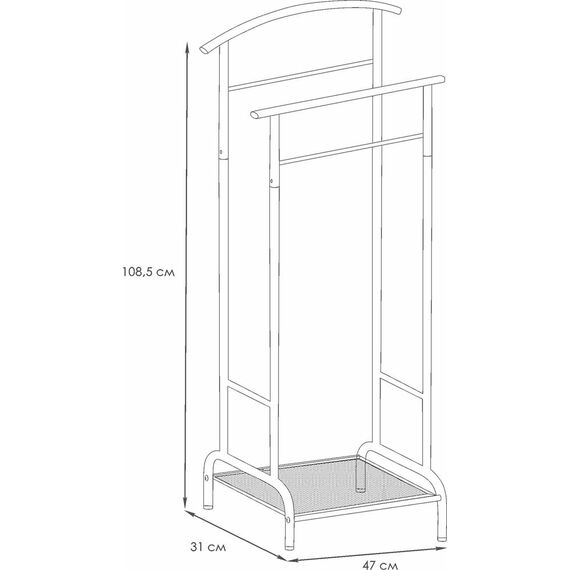 Назначение Для размещения одежды. Материал Сталь, полимерное покрытие, пластик. Габариты (Д*Ш*В) 47х30х108,5 см. Максимальная нагрузка, кг до 3 кг на плечико.