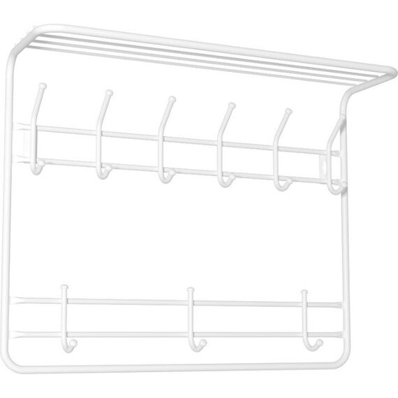 Надежная сборно-разборная конструкция. — компактная 2-х ярусная вешалка с 9-ю крючками. — удобная полка для хранения головных уборов. — допустимая нагрузка до 5 кг на крючок. — Удобный пластиковый крючок для мелочей. — Расстояние между крепёжными отверстиями 625 мм. Материал Сталь, полимерное покрытие. Габариты (Д*Ш*В) 73х58х22 см.
